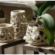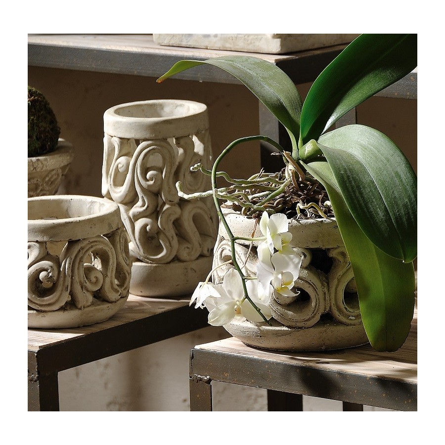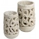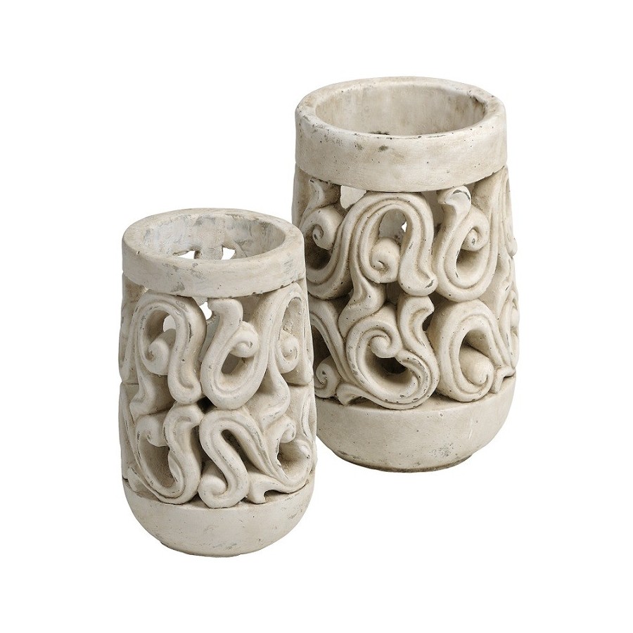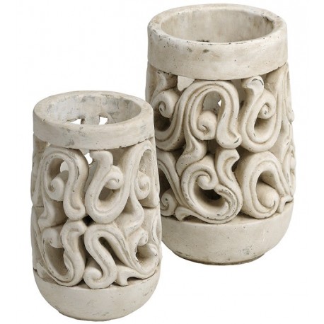 Wysoki lampion marki Belldeco w kolorze białego piasku, o niejednolotej strukturze. Stylizowany na styl starożytny ze zdobnymi wycięciami nawiązującymi do motywów roślinnych.