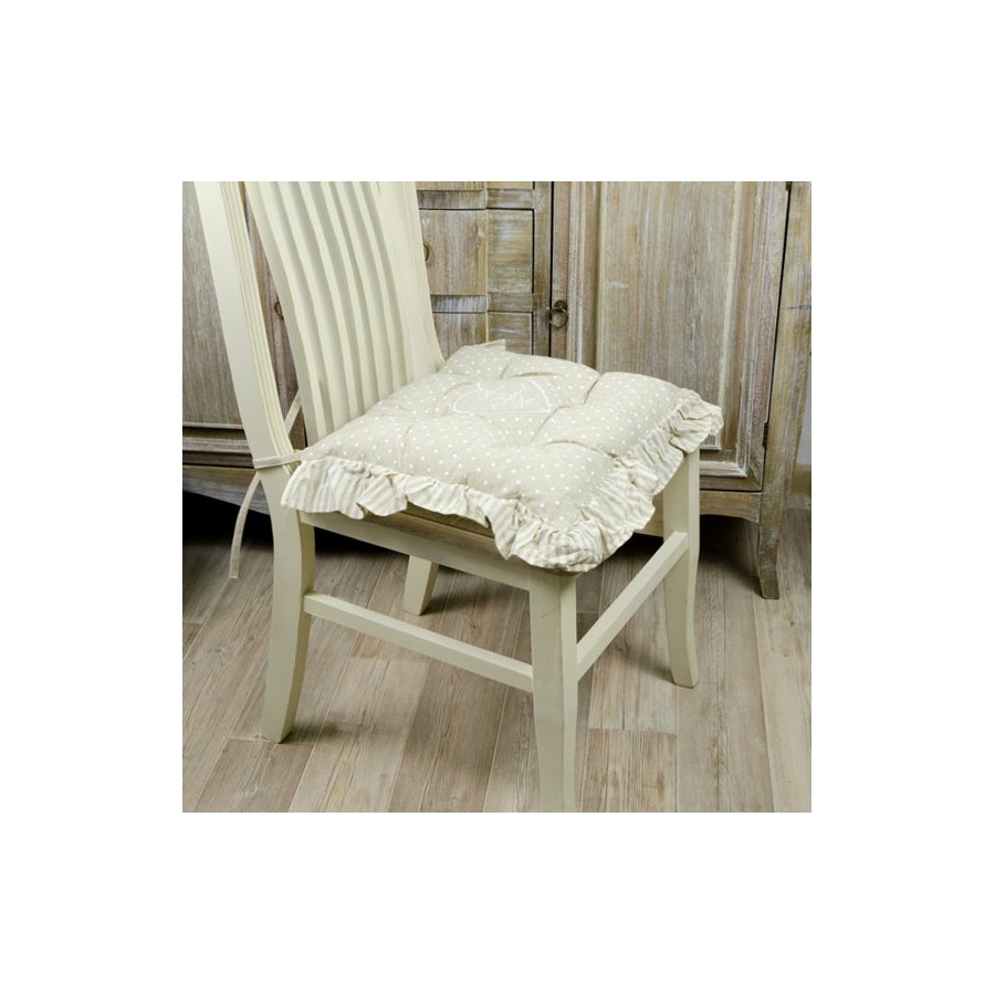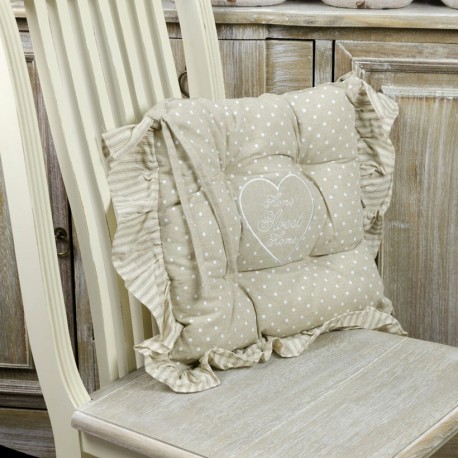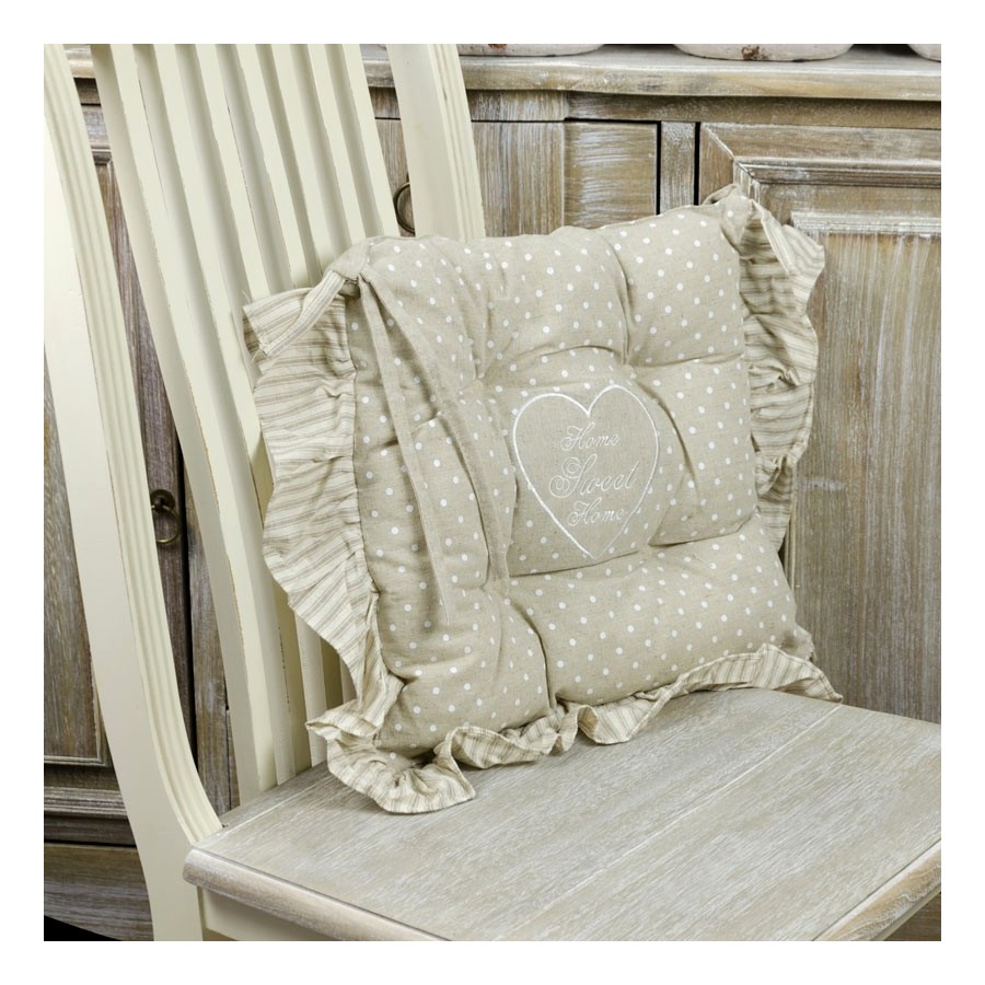 Pikowane poduszki na krzesła HOME SWEET HOME, czyli przepiękne poduszki ozdobne w stylu prowansalskim. Materiał z którego zrobione są poduszki to beżowa bawełna w białe kropki. Do poduszek doszyte są urocze falbanki w kremowo-beżowe paski, dzięki którym poduszki nie tylko wygądają ładniej, ale także są bardziej uniwersalne - pasują na krzesła o różnych rozmiarach.