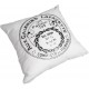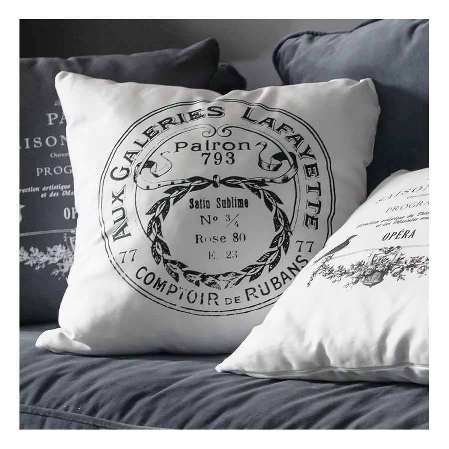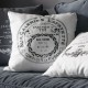 Białe poduszki Belldeco z okrągłym wzorem z francuskimi napisami w czarnym kolorze.
