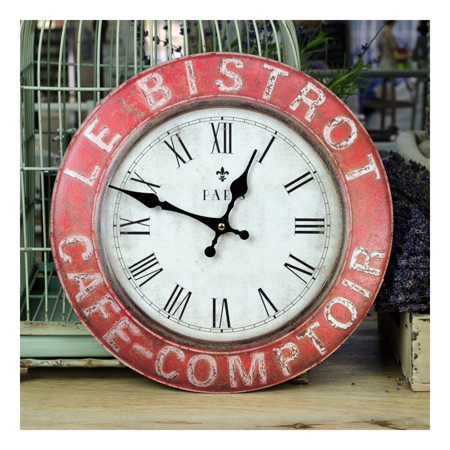 Stylizowane zegary ścienne z jasną tarcza i czerwoną obwódką z napisem w języku francuskim.
