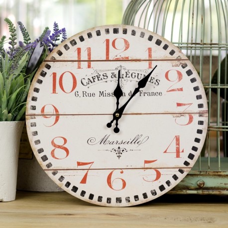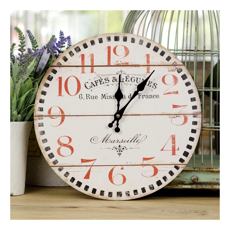 Przedstawiamy państwu niezwykły zerag retro wykonany z niezwykłą klasą. Jego stonowana barwa tarczy o średnicy 34 cm dopełni państwa wnętrze, natomiast czerwone, duże, rzucające się w oczy cyfry nie pozostaną przez nikogo niespostrzeżone. Delikatne napisy dopełniają całą stylistykę, doskonale komponując się z przetarciami na tarczy zegara. Zegary o średnicy 34 cm wykonane są z płyty MDF, zasilane są pojedyncza baterią AA.