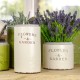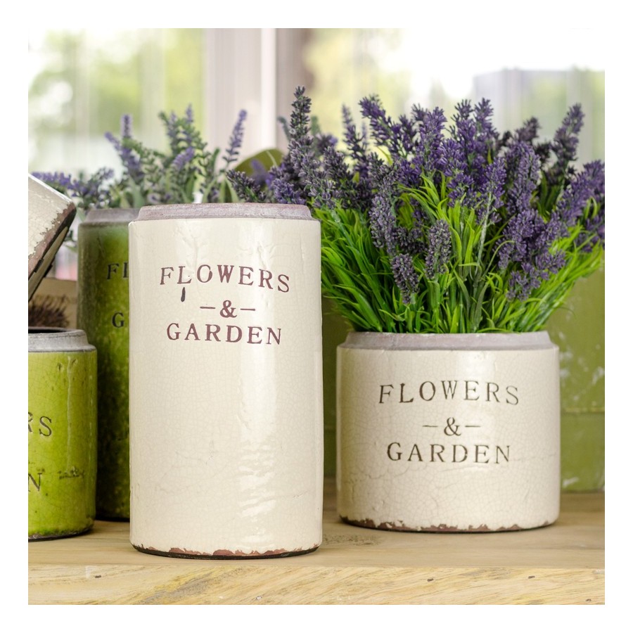 Kremowe wazony o celowo spękanej, szkliwionej powierzchni z napisem FLOWERS & GARDEN.