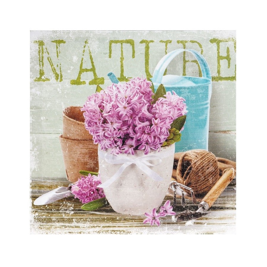Obrazki Prowansja ukazują jeden z motywów przewodnich stylu prowansalskiego, gdzie dominująca rolę odgrywają elementy przyrody. Prezentowane obrazki Belldeco to połączenie motywu roślinnego, reprezentowanego przez wiązankę hiacyntów w jasnym wazonie, oraz elementów wyposażenia ogrodniczego: konewki, grabek, łopatki. Całość dopełnia tło z Napisem NATURE.