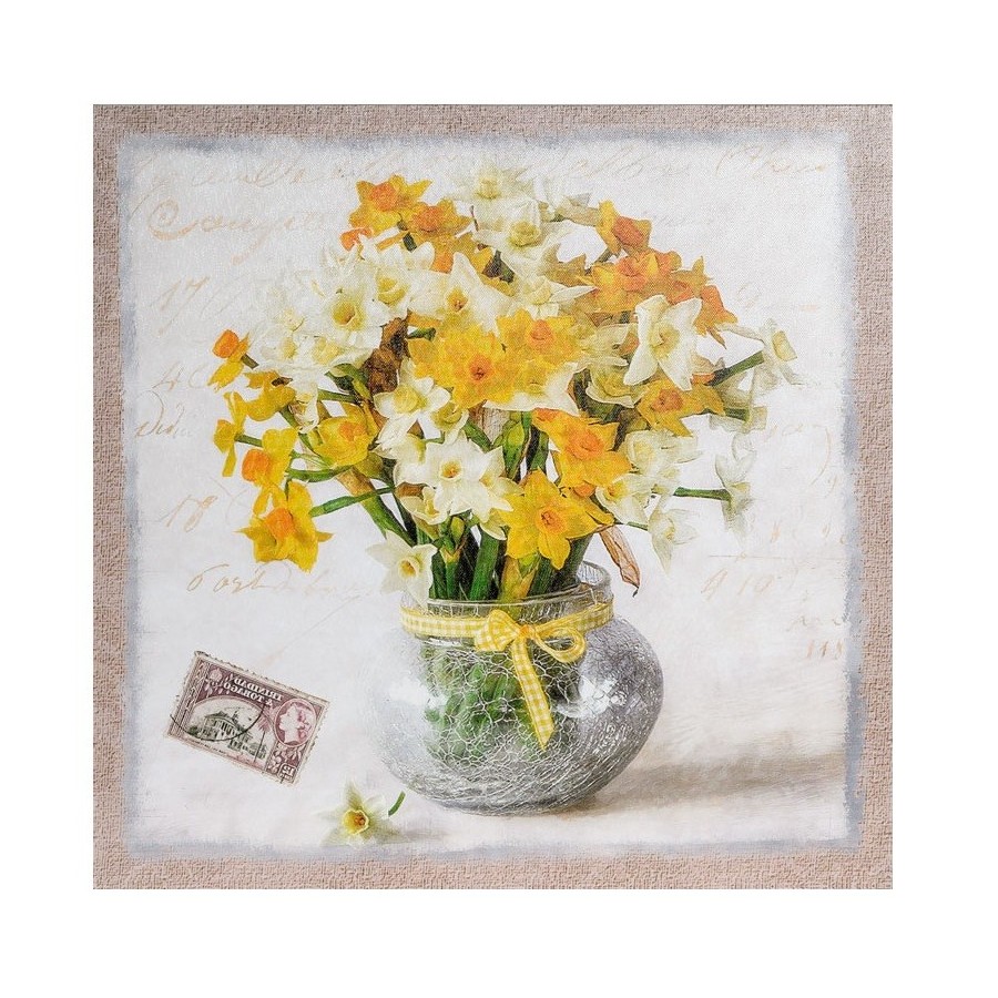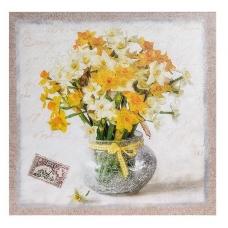 Prezentujemy niezwykły obrazek Prowansja z serii Pocztówka ukazujący bukiet cudownych żółtych i białych żonkili w szklanym wazonie.