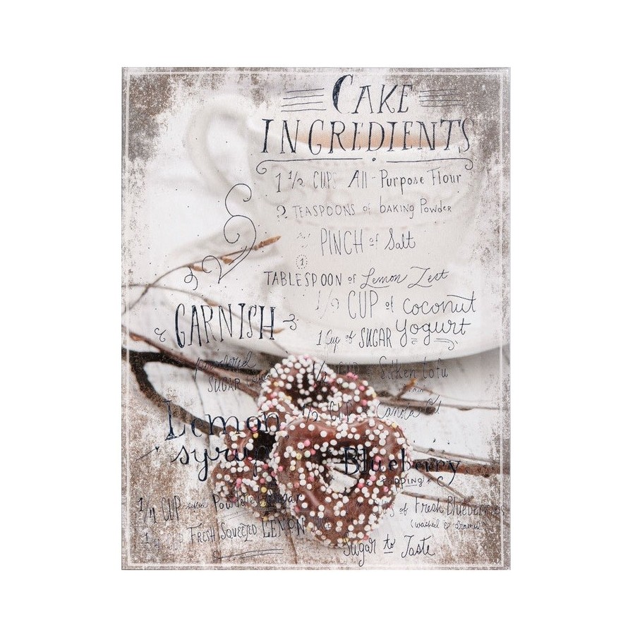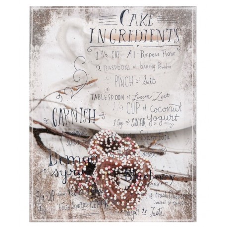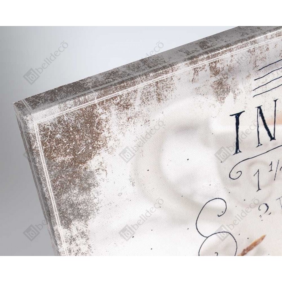 Obrazy do kuchni wykonane metoda nadruku na płótnie osadzone w sosnowej ramie to zupełnie nowe spojrzenie na kwestię sztuki. Połączenie grafiki (apetycznei wyglądające donuty w kształcie serca z jasną filiżanka w tle) z delikatnym, ale dobrze widocznym, imitującym ręczne notatki przepisem to propozycja dla nowoczesnego wnętrza. Całośc utrzymana w jasnej, stonowanej kolorystyce.