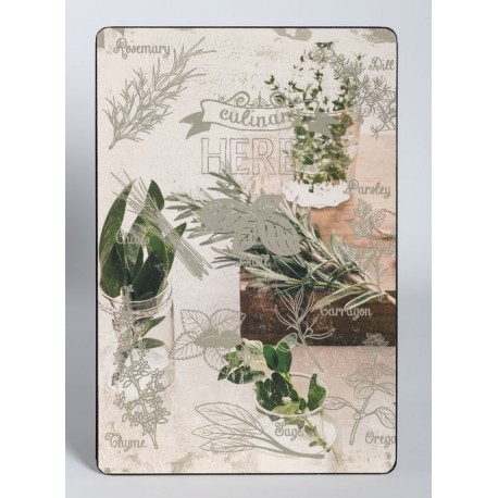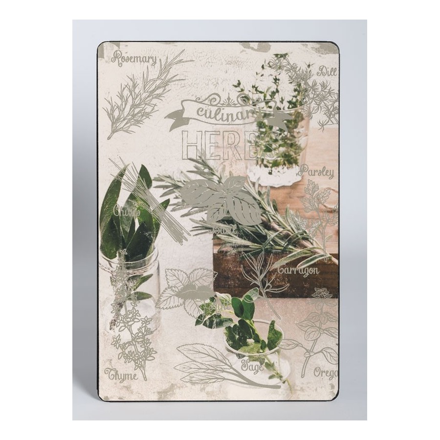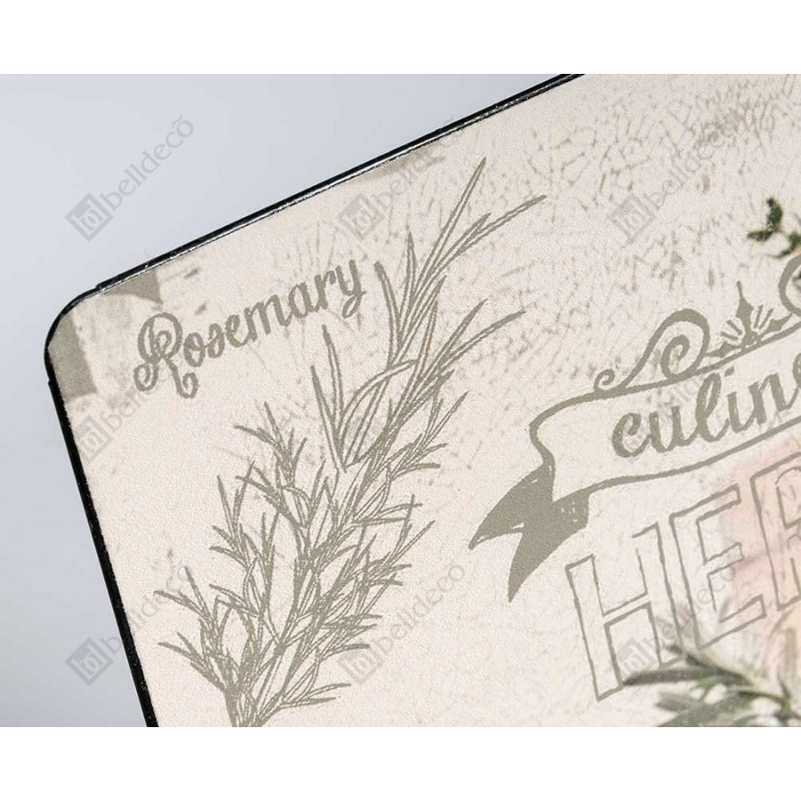 Obrazki do kuchni firmy Belleco to połączenie kompozycji ścietych ziół poustawianych w niewielkich słoiczkach na całej płaszczyźnie tabliczki, z ich graficznymi odpowiednikami w odcieniu szarości. Całość świetnie oddziałuje na zmysły obserwatora. Dopełnieniem stylizacji jest napis "kulinary HERBS", który wyłania się spomiedzy zielonych listków.