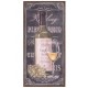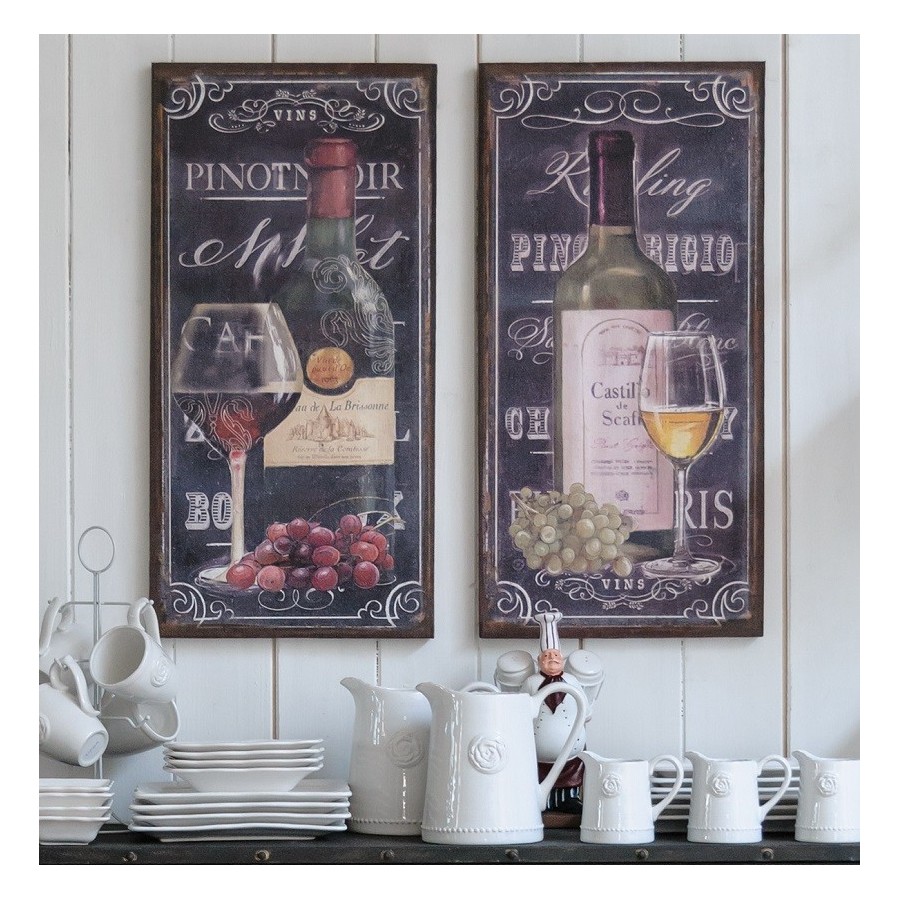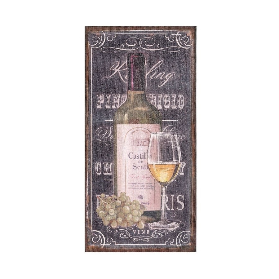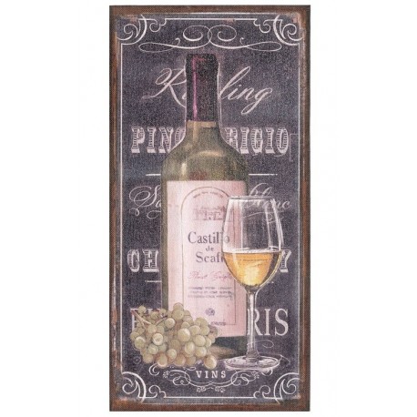 Wąski obraz Vintage namalowany na prostokątnej desce przedstawia kieliszek, butelkę wina oraz kiść winogron.