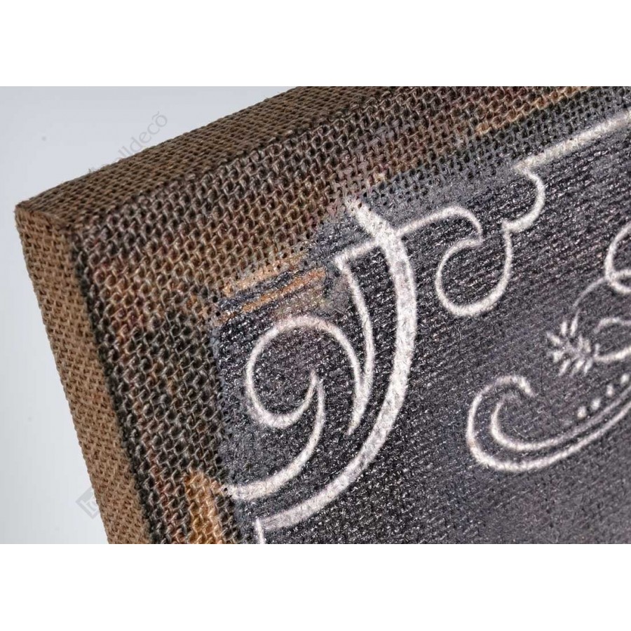 Prostokątny obraz Belldeco został obdarzony czarnym tłem ze znajdującymi się na nim napisami o białym kolorze. Na brzegach płótna namalowano brązową ramę, zdobioną białymi elementami. Centralną część obrazu stanowi grafika butelki czerwonego wina, kieliszka wypełnionego do połowy oraz dojrzałej kiści czerwonych winogron.