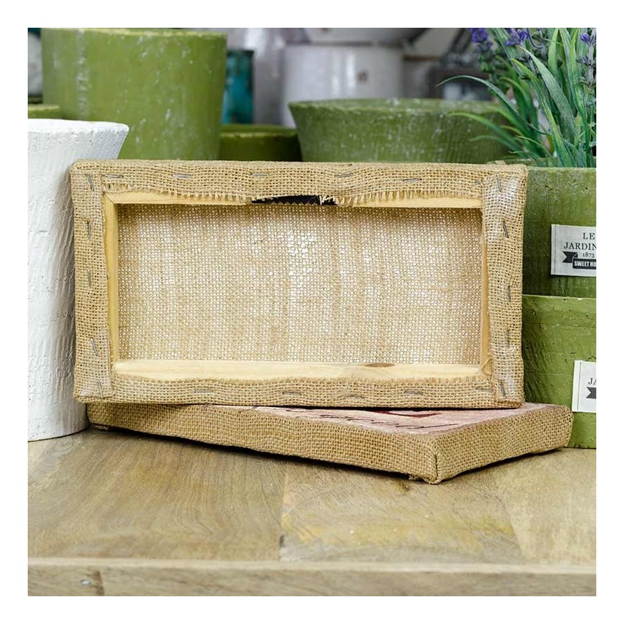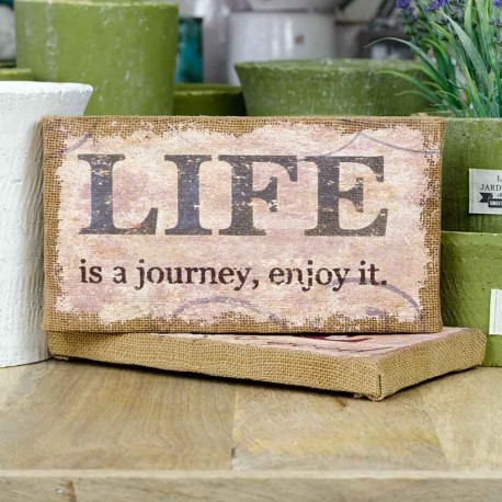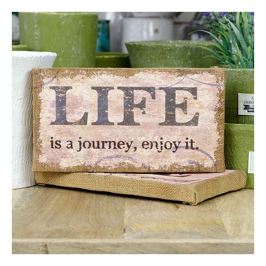 Zgrabne, utrzymane w naturalnej kolorystyce, wykonane na tkanienie o splocie płóciennym obrazki z napisami, o niecodziennej fakturze.