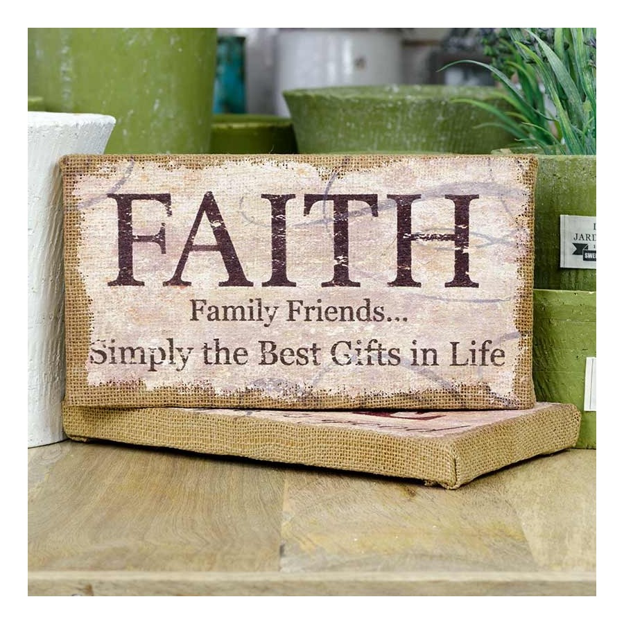 Osadzone na drewnianej ramie obrazki z napisami w stylu retro pozwolą Państwu cieszyć się atmosferą spokoju i naturalności. Na obrazku znajduje się napis "FAITH. Family, Friends... Simply the Best Gifts in Life", nadrukowany na tkaninie o splocie płóciennym.