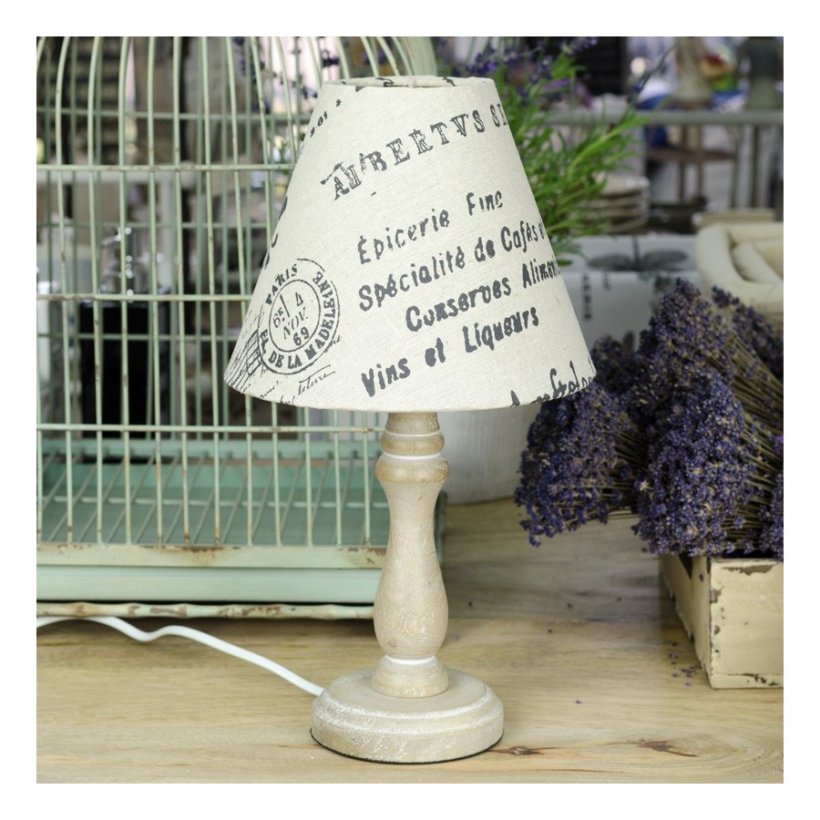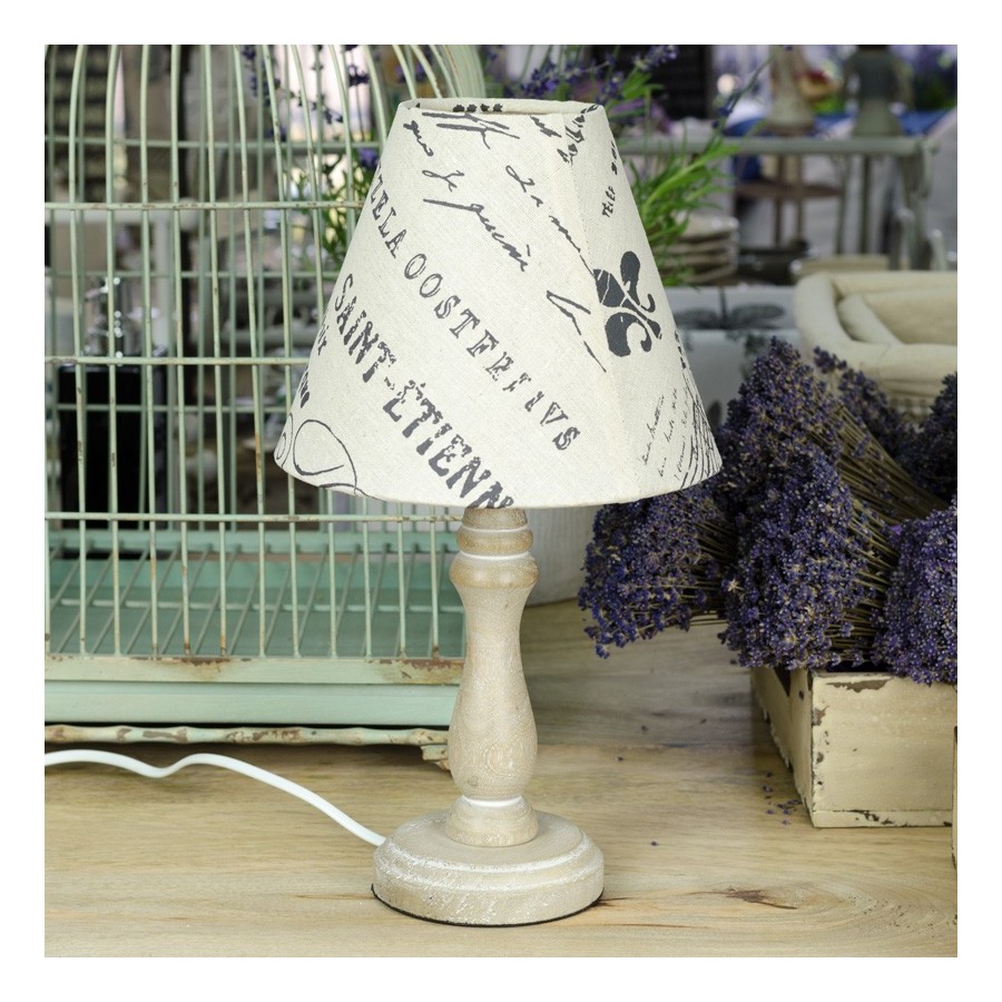 Lampy prowansalskie przeznaczone do postawienia stanowią wyśmienitą dekorację, która w piękny sposób oświetli Twoje mieszkanie. Lampa składa się z drewnianego stojaka, do którego podłączony jest biały kabel oraz z bawełnianego klosza z napisami w szarym kolorze. Całość prezentuje się uroczo i efektownie.