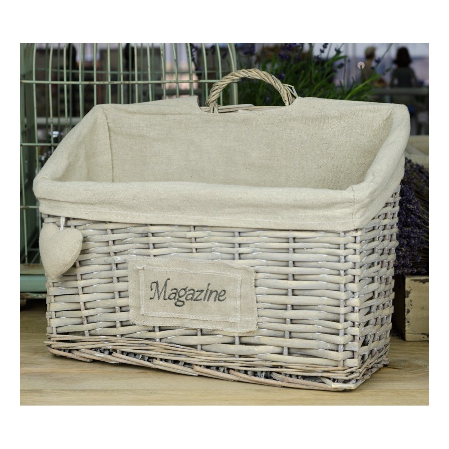 Wiklinowy kosz o dużej pojemności to ładnie wykonany i niezwykle użyteczny pojemnik na gazety, wyposażony w wygodną rączkę. Wnętrze pojemnika wyściełano beżowym płótnem i zawiązano gustowną wstążeczką.