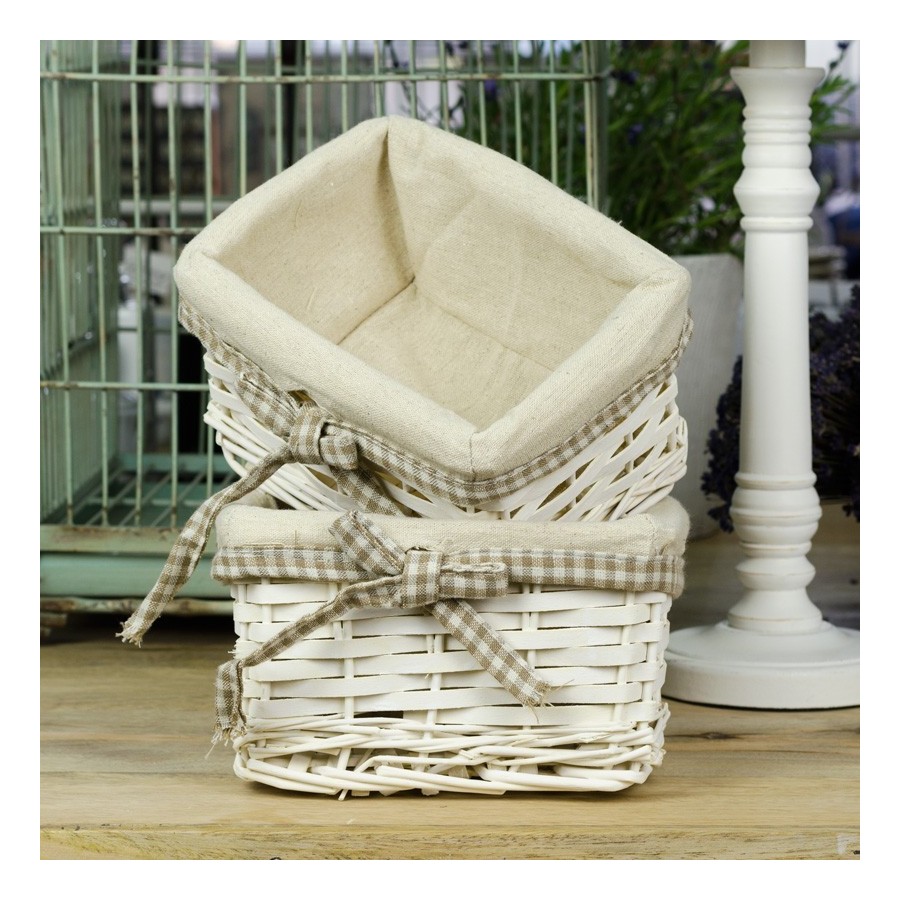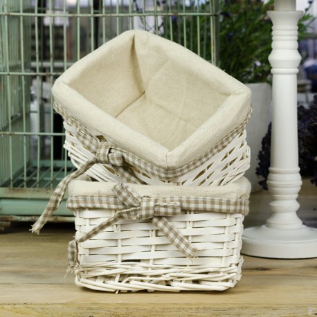 Cudownie wyglądający wiklinowy kosz upleciony z jasnej wikliny to piękna propozycja, która wpasuje się w każdy styl urządzenia domu. Kosz wyściełano w środku lnianym, beżowym płótnem i obwiązano beżowo-białą tasiemką, zakończoną kokardką. Polecamy naturalne kosze wiklinowe!