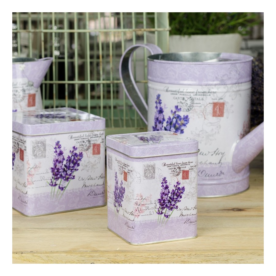 Funkcjonalne metalowe pojemniki o prostokątnym kształcie z przewodnim motywem lawendy. Polecamy!