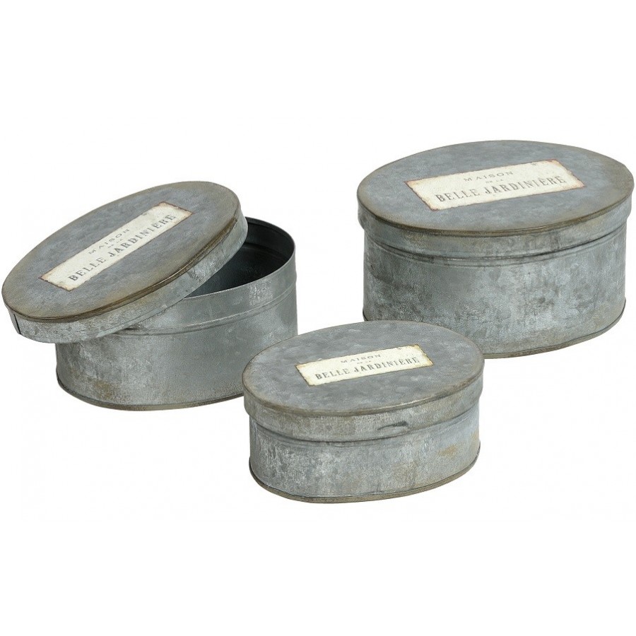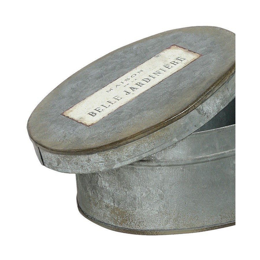 Urokliwe metalowe pudełko, średnie. Cudowny kontrast klasycznej formy o owalnym kształcie z surowością materiału. Otwierane od góry matelowe pudełko z francuskim napisem, idealnie wkomponuje się nie tylko we wnętrze w stylu francuskim. Do łazienki, sypialni czy kuchni.