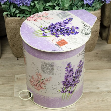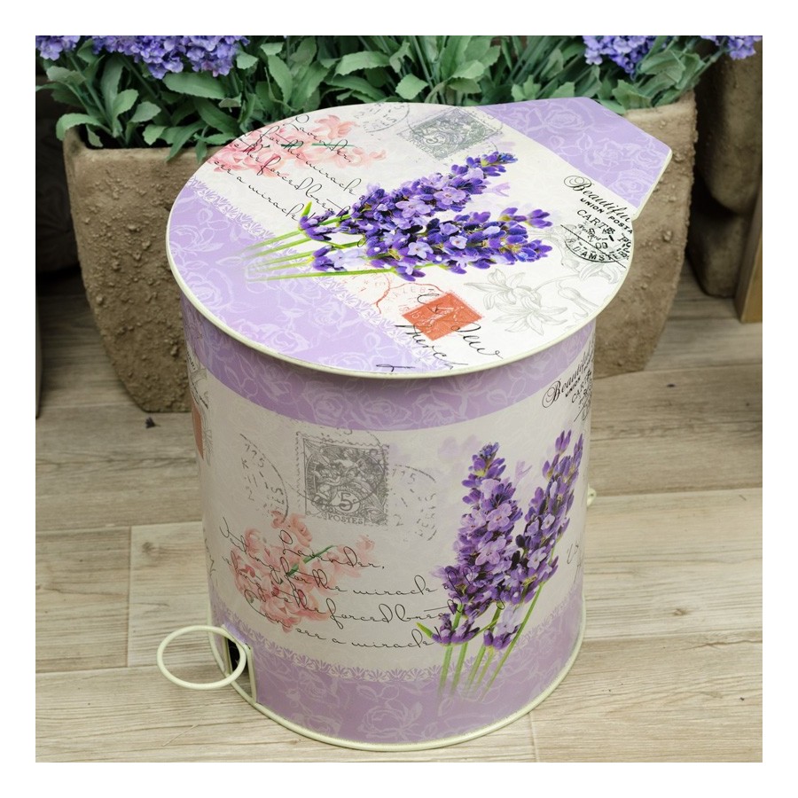 Niezwykły dzięki kolorystyce i ozdobnikom kosz na śmieci z wiekiem, które chroni pomieszczenie przez nieporządanymi zapachami. Dominujący motyw lawendy nie przytłacza, dzięki odpowiednim dodatkom w postaci delikatnych napisów i stempli. Kosz na śmieci świetnie prezentował sie będzie w pokoju dziecięcym, holu, czy zaciszu kawiarnianym.