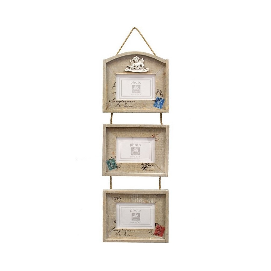 Potrójna ramka drewniana, wisząca. Ramki drewniane z motywem kartek pocztowych, połączone sznurkiem.
