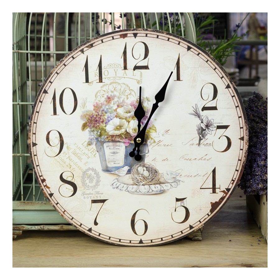Tło całości z kolorową kompozycją kwiatową w blaszanym wiaderku i gniazdkiem ptaków na pierwszym planie nadaje zegarowi niezapomnianego, delikatnego uroku. Czarne kontrastujące z tłem wskazówki i cyfry arabskie są doskonale widoczne. Celowe przetarcie i odrapania mają stanowić metaforę upływającego czasu.