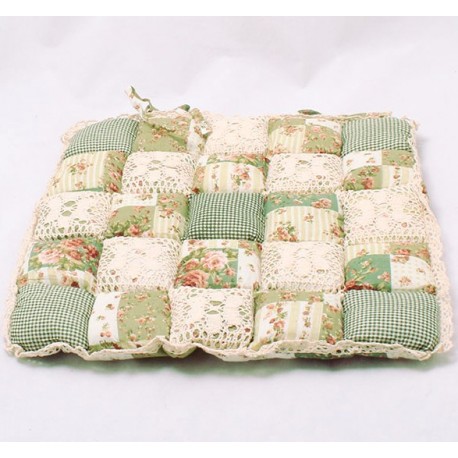 Bardzo pomysłowa poduszka na krzesło, utworzona z małych kwardacików, z których każdy jest wyszyty z innego materiału, dzieki czemu mamy wrażenie niezwykłej różnorodności. Część z tych elementów jest dodatkowo ozdobiona koronką podobnie jak cała krawędź poduszki. Całość tworzy enegretyczną ciepłą kompozycję, która będzie efektowna ozdobą wnętrza.