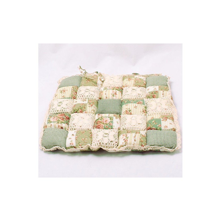 Efektowna poduszka na krzesło w stylu prowansalksim w odcieniach zieleni i źółci. Zdobiona licznymi koronkami.