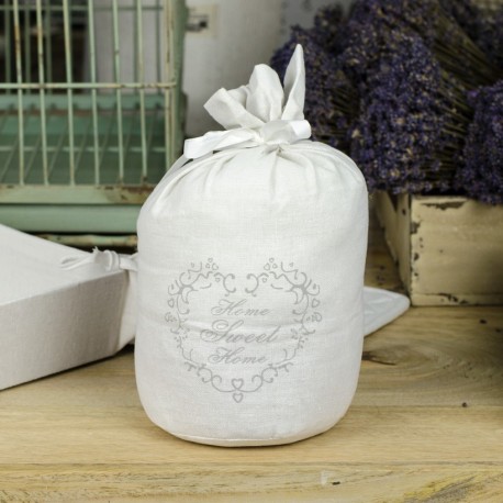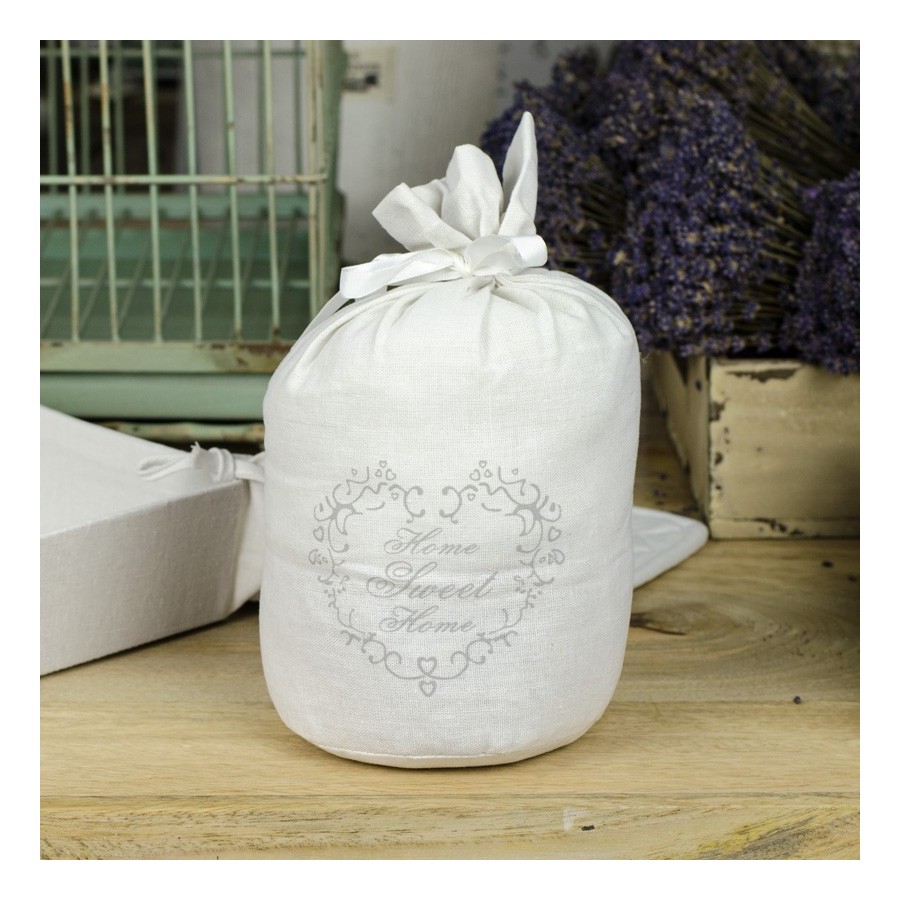 Stoper do drzwi to biały worek przepasany elegancką wstążeczką, udekorowany napisem oraz wizerunkiem serduszka. Stoper jest niezwykle pożyteczną rzeczą, ale także w piękny i zrównoważony sposób ozdobi pomieszczenie.