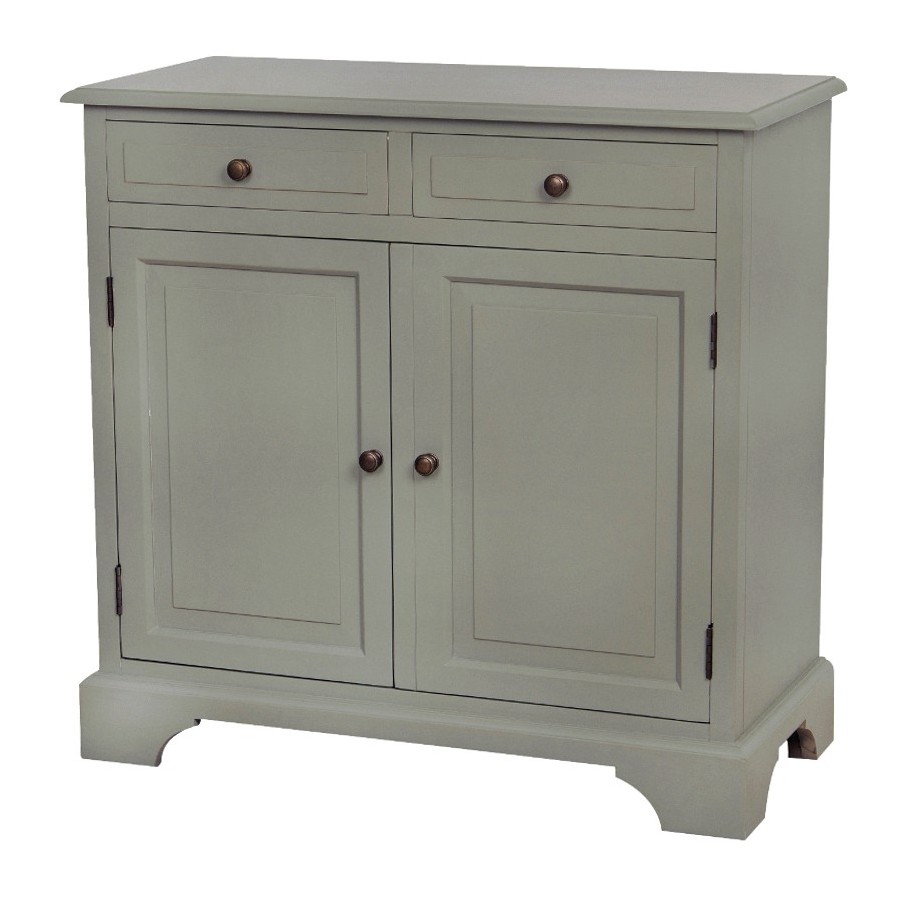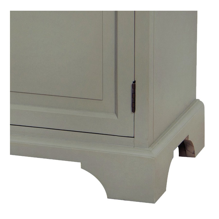 Komoda Prowansalska to piękny mebel w odcieniu eleganckiej szarości, wyposażony w szuflady i półki za gustownymi drzwiczkami.