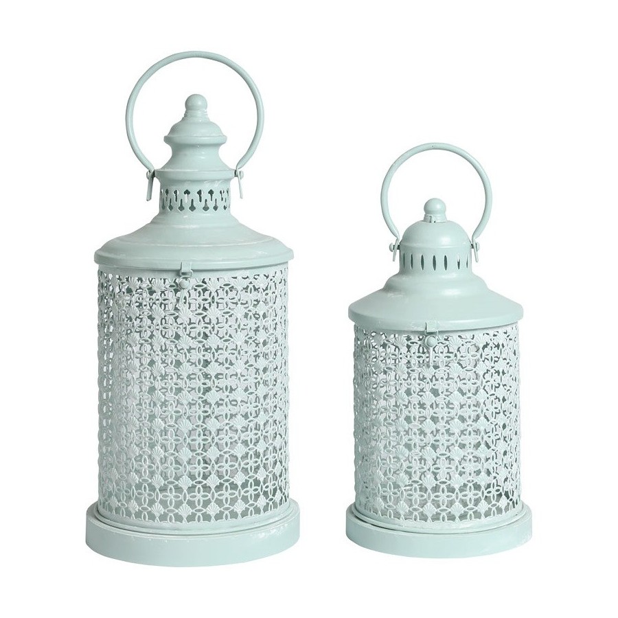 Prezentujemy lampiony metalowe marki Belldeco z serii Dalia, które składają sie z metalowej ażurowej obudowy oraz szklanego wkładu w kształcie walca, który łatwo można wyjmować. Obudowa przypomina dawne lampiony z okrągłym uchwytem umożliwiającym zmianę miejsca, całość utrzymana jest w jasnej, niebieskiej kolorystyce.