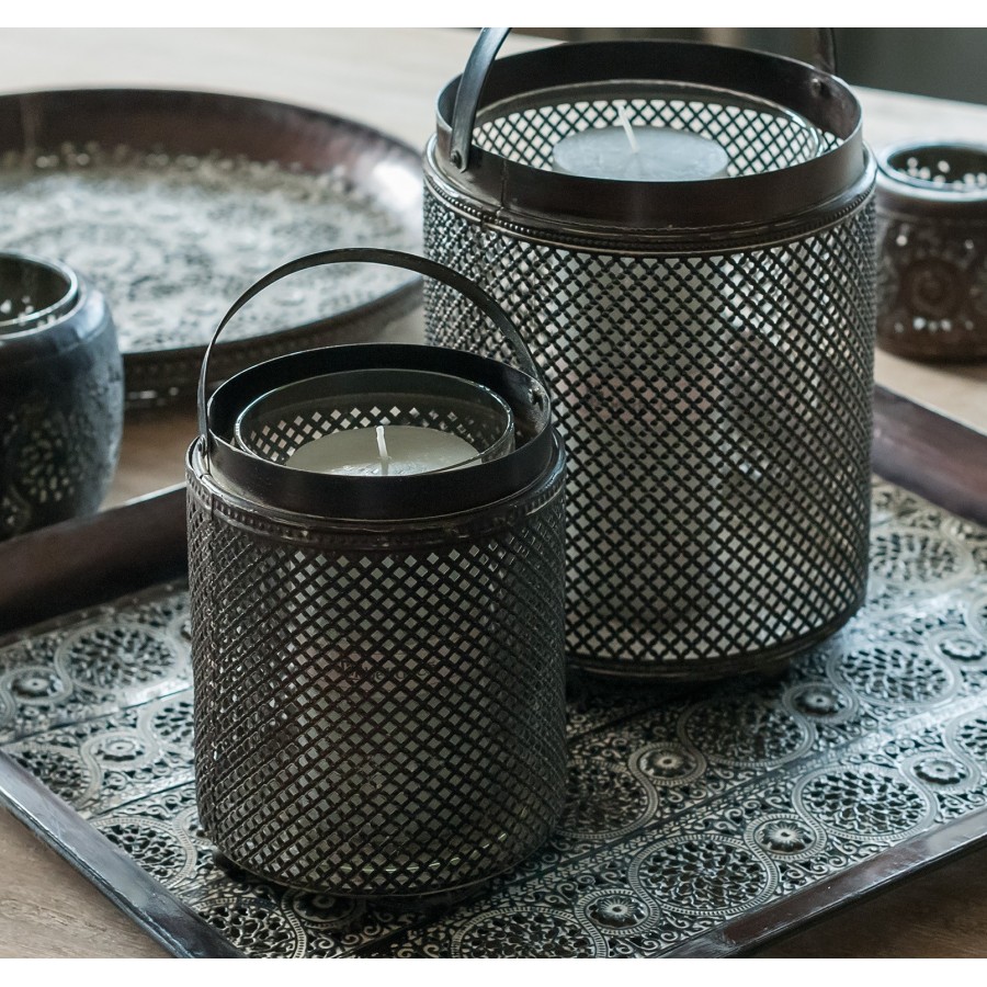 Oryginalny w swej prostocie lampion ażurowy marki Belldeco wyposażony w duży szkłany wkład, w którym docelowo umieszczane mają być świece - źródło światła. Cała konstrukcja wsparta jest na czterech metalowych kulkach, a z góry uwieńczona została wygodnym uchwytem ułatwiającym przenoszenie lampionu w różne miejsca.