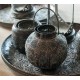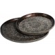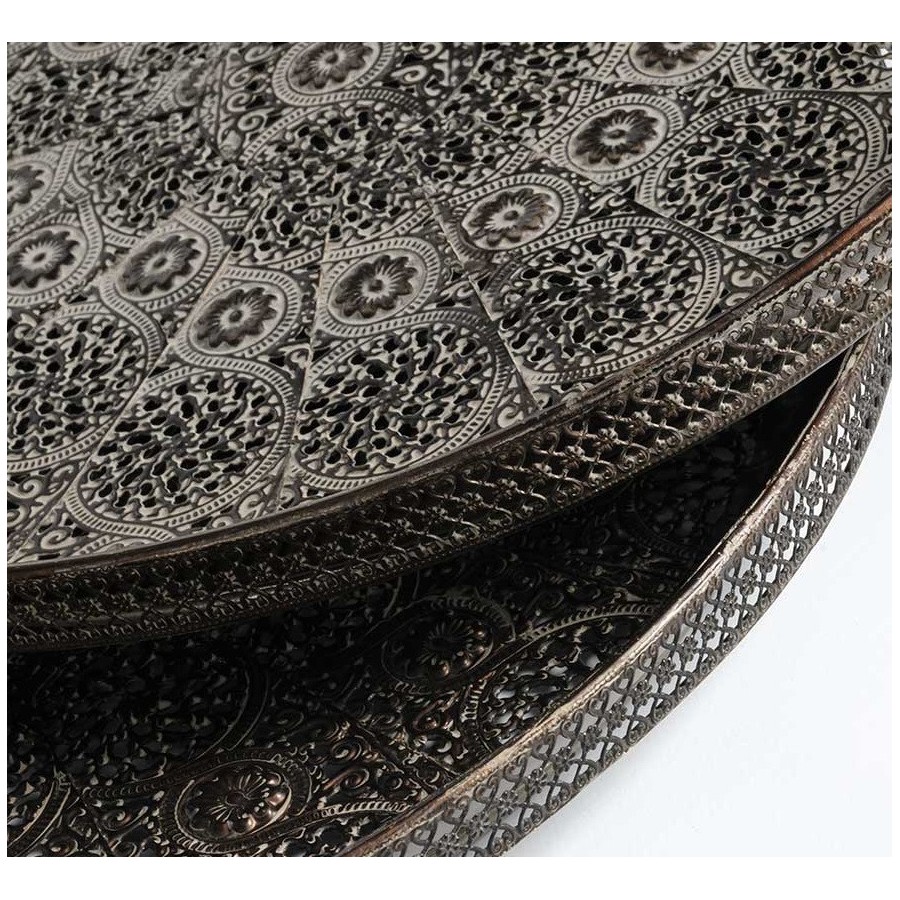 Oryginalna metalowa taca z pomysłowo rozmieszczonymi otworami współgrającymi z bogatymi zdobieniami. Dodatkowo liczne przebawienia, zadrapania, wypukłości nadają tacy niesamowitego wyglądu, podobnie jak zawinięte do środka brzegi, które mogą pomóc utrzymać stabilną pozycję zastawy.