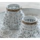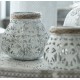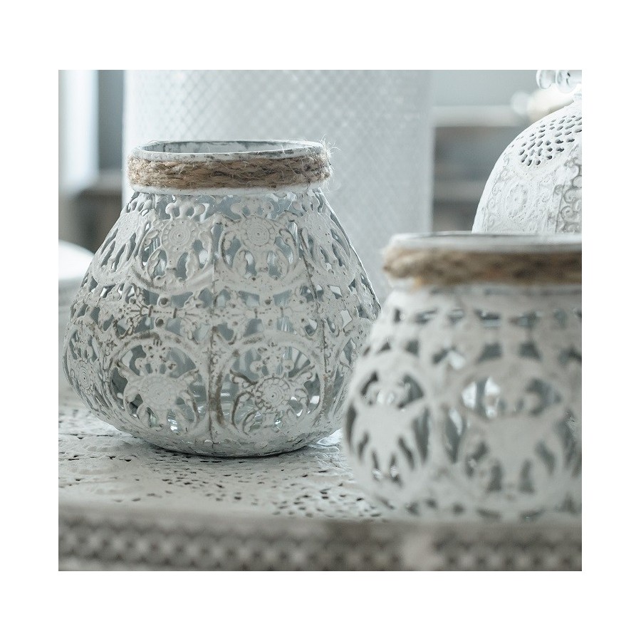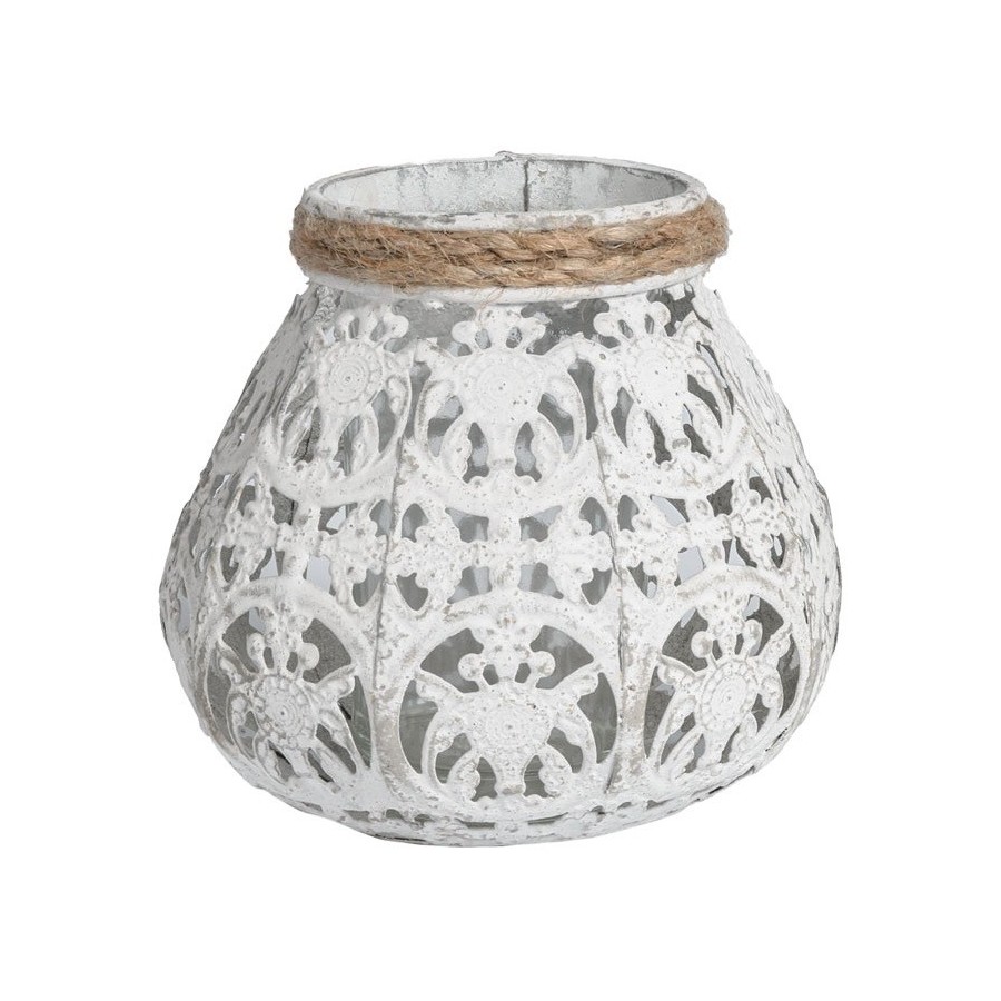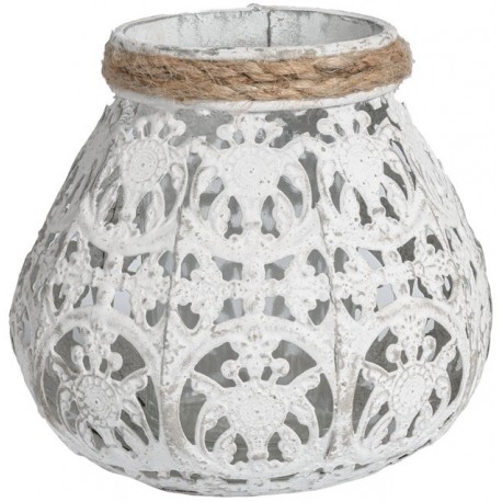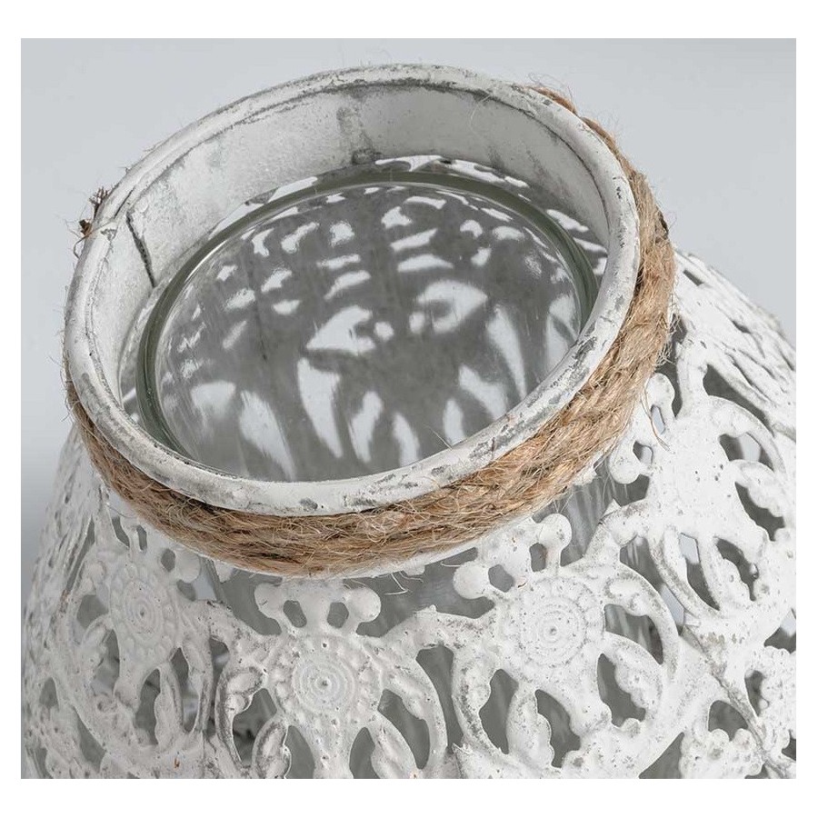 Elegancko postarzany, ażurowy lampion w kolorze białym, z celowymi zabrudzeniami i odrapaniami. U szczytu w celach zdobniczych obwiązany szarym, sizalowym sznurkiem. Wewnątrz znajduje się szklany wkład w kształcie walca, do którego wkłada sie świece. Zabezpiecza on je przed podmuchami wiatru, stąd lampion sprawdzi się także na zewnatrza np. na tarasie czy w ogrodzie.