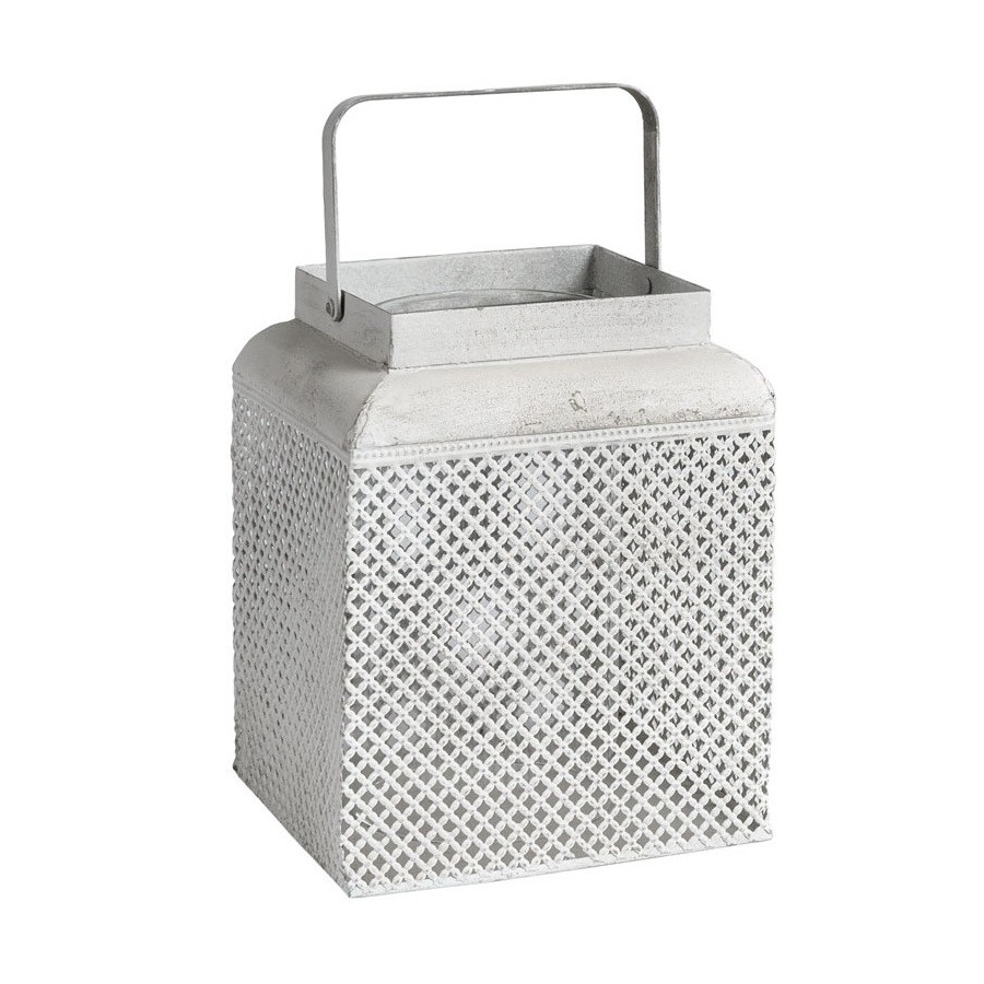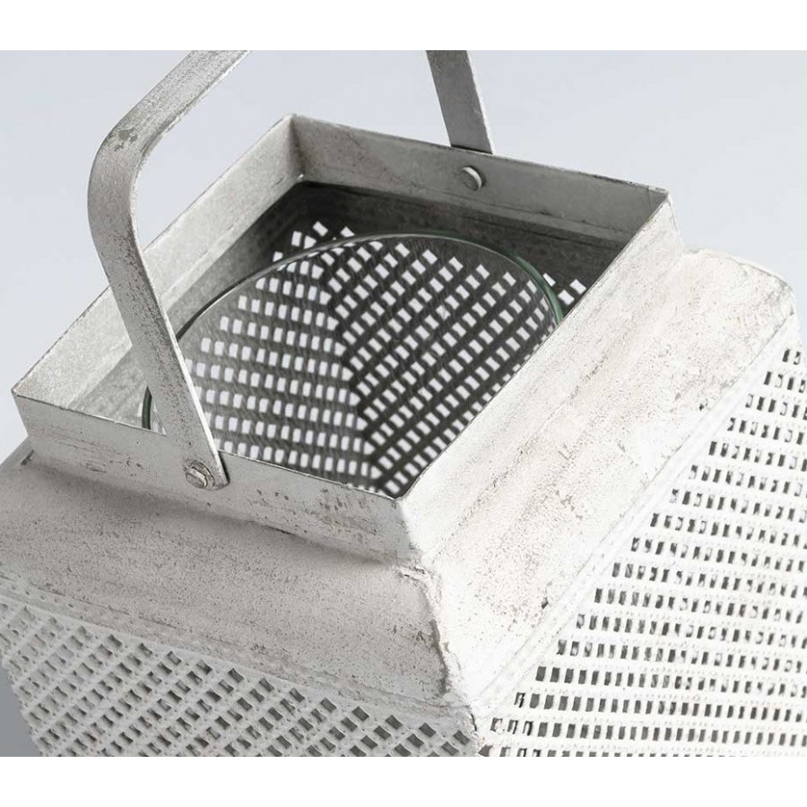 Celowo postarzany, delikatnie przybrudzony i podrapany biały lampion wyprodukowany przez firmę Belldeco, z klasycznymi ażurowymi ściankami. Niezapomniany klimat pełen blasku świec tworzy szklany wkład, chroniący świece przed wiartem i innymi czynnikami atmosferycznymi oraz siatkowane ściany, przez które światło klimatycznie rozpraszać się będzie na tarasie bądż w ogrodzie. Lampion można także powiesić na praktycznym uchwycie.