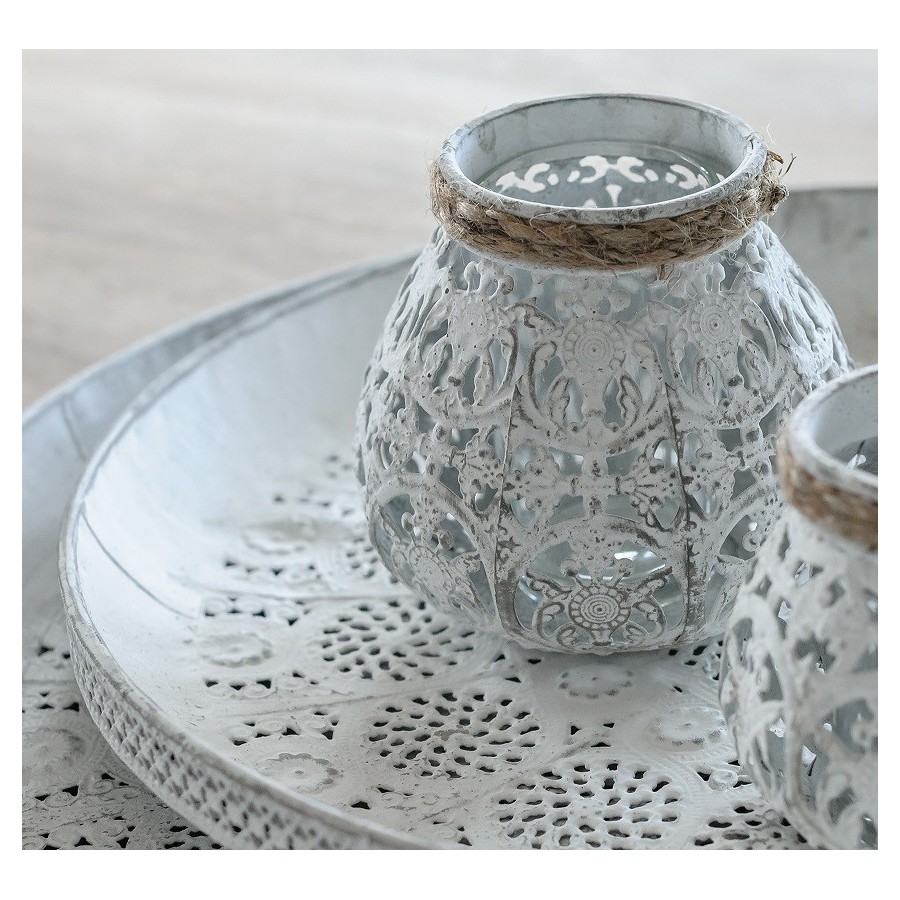 Bogato zdobiona taca Belldeco z ażurowymi wykończeniami i celowymi otarciami na białej farbie.