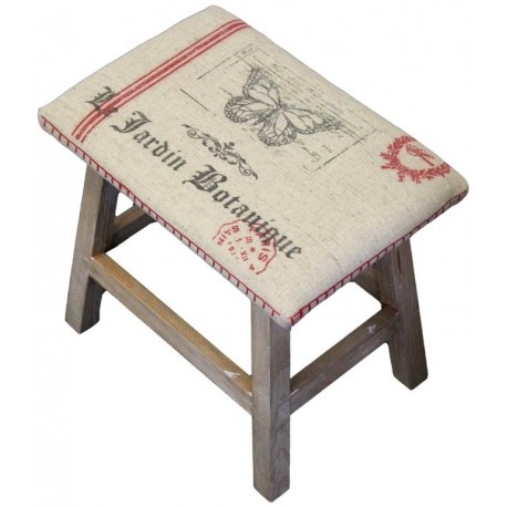 Stołek prowansalski to mebel wykonany w stylu prowansalskim, zbudowany z brązowego drewna i obity kremowo-czerwonym materiałem z wizerunkiem motyla i napisami. Stołek wygląda schludnie i uroczo – idealna dekoracja do pomieszczenia urządzonego w prowansalskim stylu. Meble prowansalskie - pięknie wykonane, funkcjonalne i z klasą!