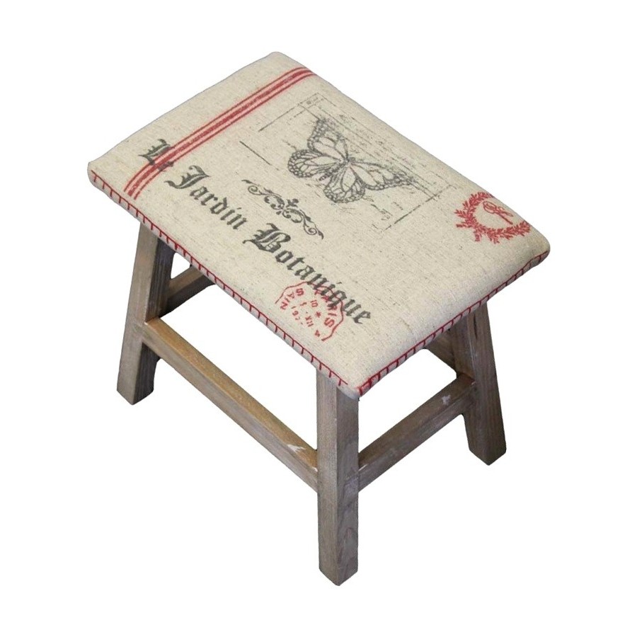 Stołek prowansalski to wykonany z drewna mebelek, z ładnym, kremowym obiciem z wizerunkiem motyla.