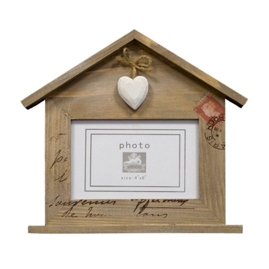 Drewniana ramka w kształcie domku z daszkiem i podstawką stanowi nietypowe obramowanie na prostokątną fotografię. Ramka została ozdobiona drewnianym sercem, które zostało przyczepione do całości lnianym sznurkiem o jasno-brązowej barwie. Po prawej stronie widnieje czerwony znaczek i stempel.