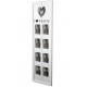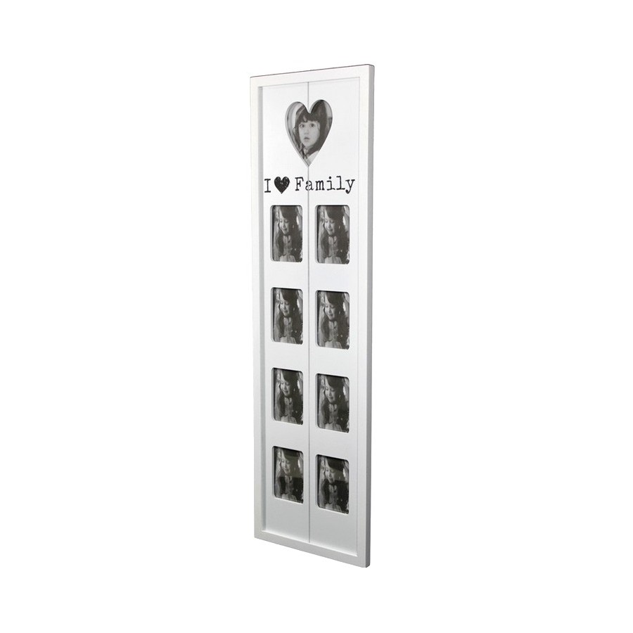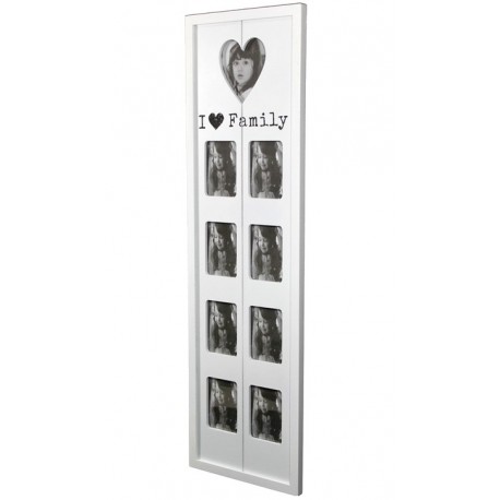 Niezwykła drewniana ramka na zdjęcia w całości pomalowana na biało. Ta duża ramka na zdjęcia może posłużyć do stworzenia wielkiego rodzinnego portretu, a wszystko ze względu na ilość miejsc na zdjęcia, których jest aż 9. Osiem z nich w kształcie prostokąta jest symetrycznie ułożonych w dwóch pionowych rzędach, natomiast nad napisem I<3 family jest okienko w kształcie serca.