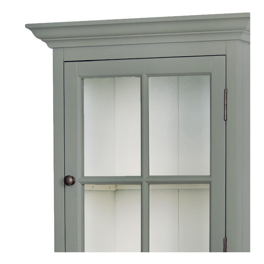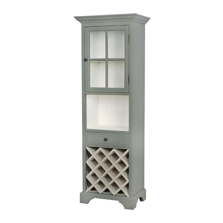 Wysoki regał prowansalski z ładnym kratkowaniem u dołu – szafeczką na butelki z winem, wysuwaną szufladą i przestronnymi półkami, w tym jedną zamykaną eleganckimi, przeszklonymi drzwiczkami to pięknie wyglądający mebel w odcieniach cementowej szarości i śnieżnej bieli.