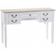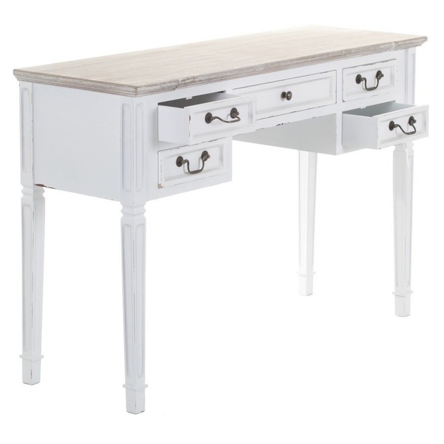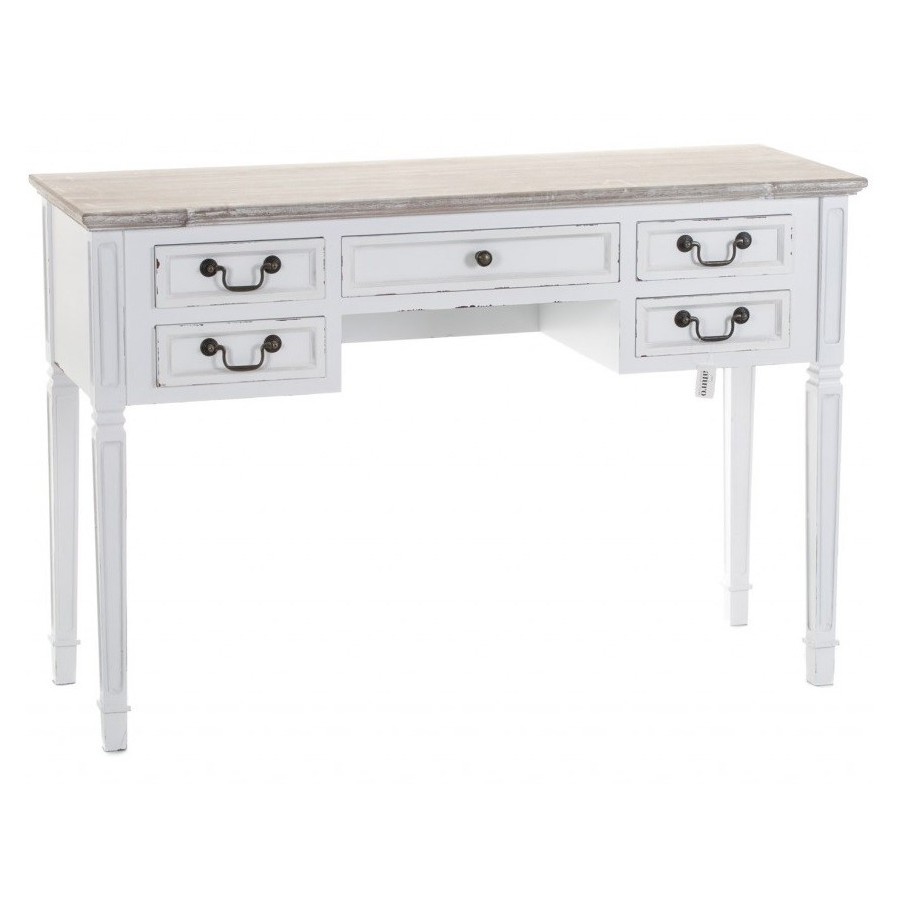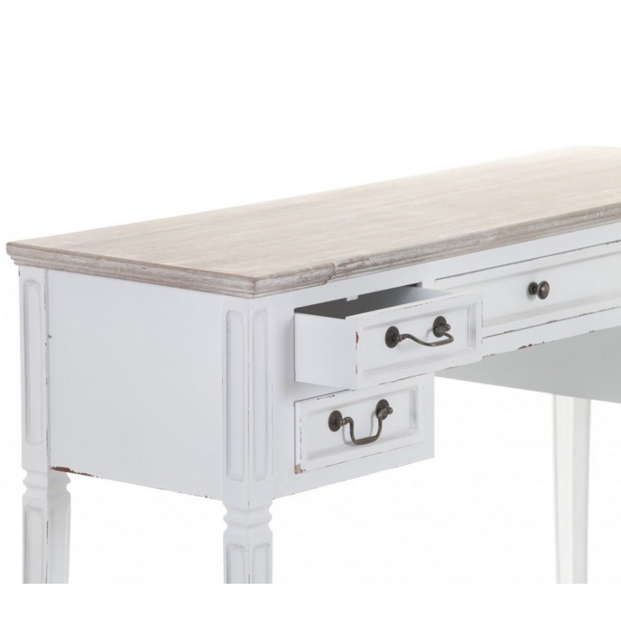 Elegancka toaletka w stylu prowansalskim z serii Aluro Palida obejmującej białe meble prowansalskie z przetarciami na krawędziach. Mebel może posłużyć Państwu zarówno jako toaletka jak i jako biurko. Posiada cztery mniejsze i jedną dłuższą szufladkę z prostymi, metalowymi uchwytami. Blat konsoli ma brązowy kolor i jest ręcznie szczotkowany i bielony. Do konsoli można w naszym sklepie dobrać inne białe meble Aluro w stylu prowansalskim z przepięknej serii Palida.