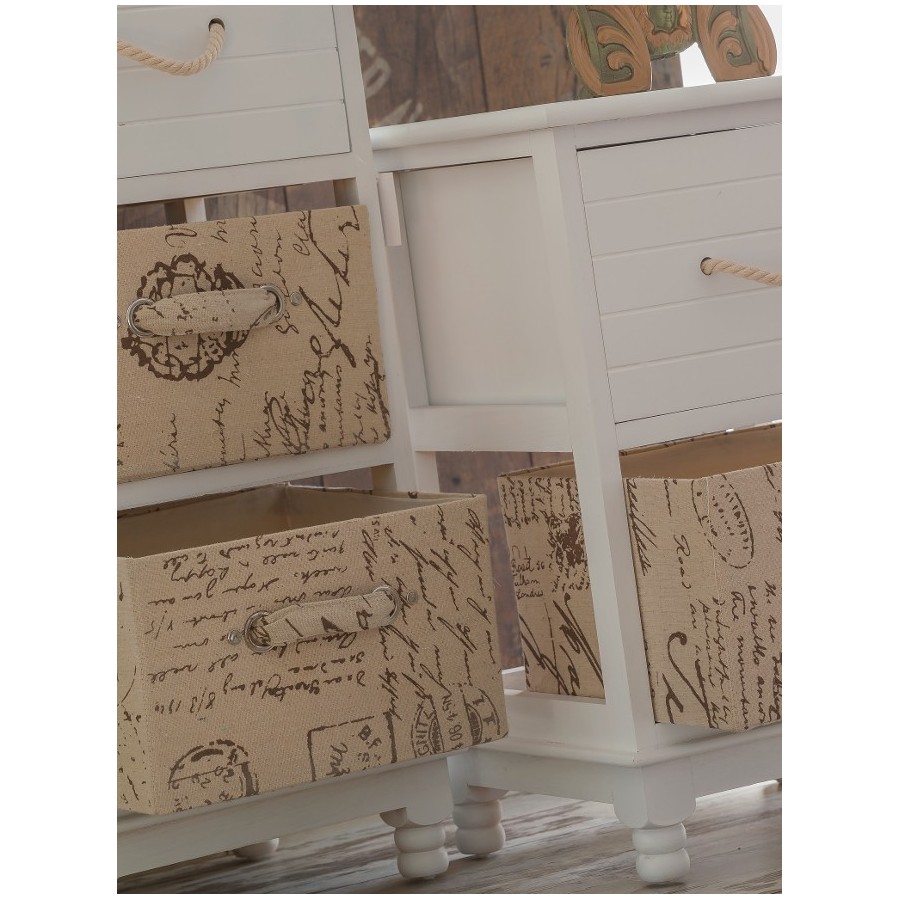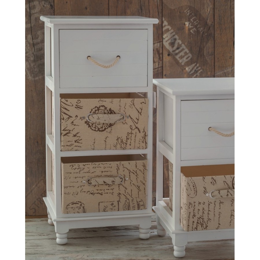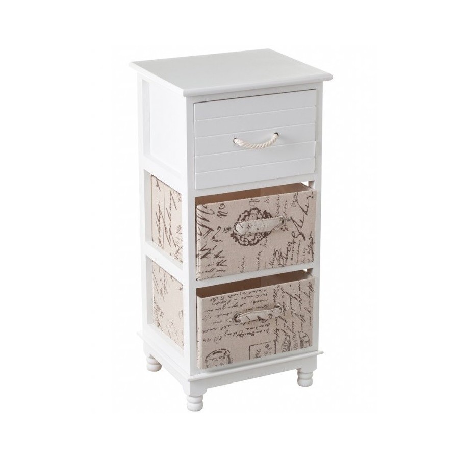 Szafka Filatti z trzema szufladami to kompozycja drewna w kolorze białym, z dwoma szufladami obitymi materiałem w prowansalskim stylu, nawiązującym do ręcznie pisanych kart pocztowych. Świetnie sprawdź się jako praktyczna szafka nocna, szafka łazienkowa lub mebel do pokoju dziecinnego.