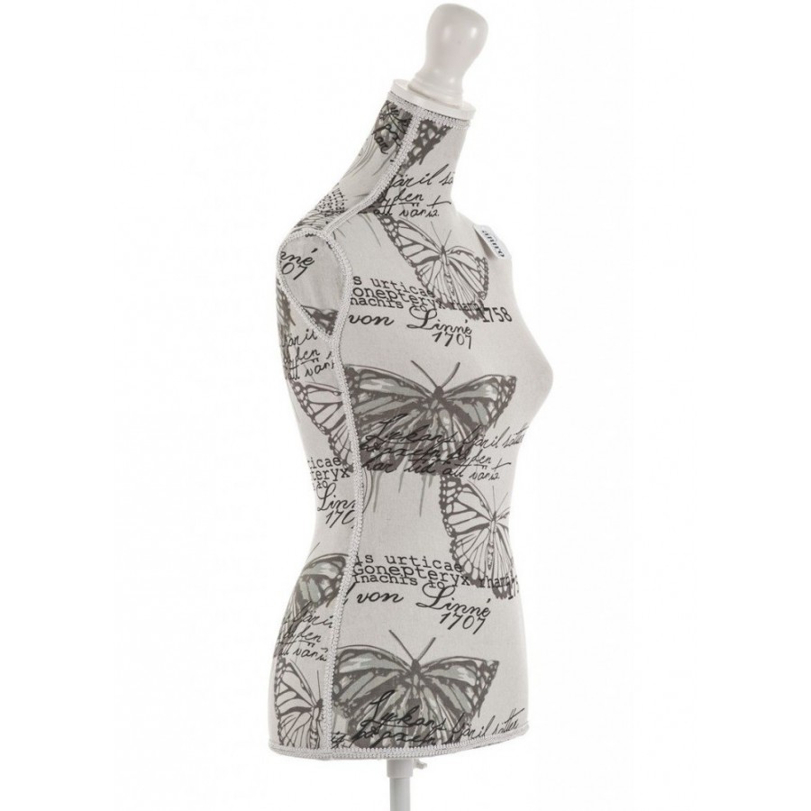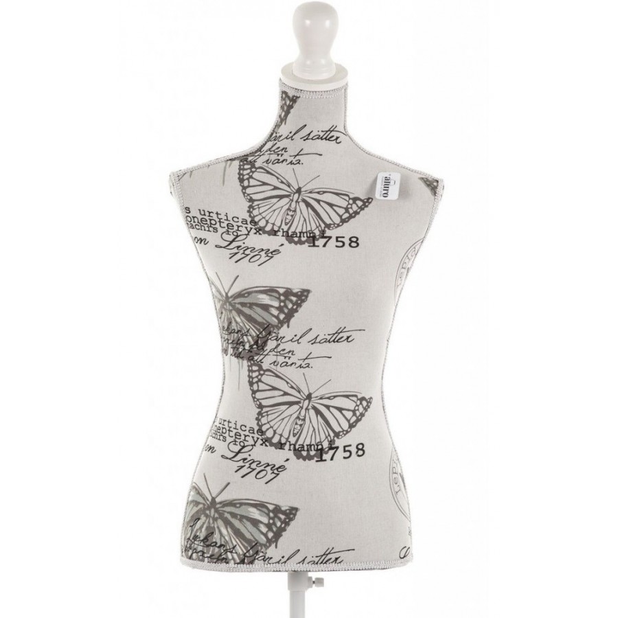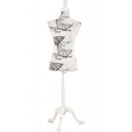Manekin w stylu prowansalskim z kolekcji Filatti, wykonany z bardzo lekkiego, ekologicznego drewna paulownia, ustawiony na klasycznym stojaku z regulacją wysokości. Manekin obszyty jest materiałem z ciekawym wzorem z motywem motyla i delikatnych napisów. Może słuzyć jako wieszak na ubrania, bądź być elementem dekoracyjnym!