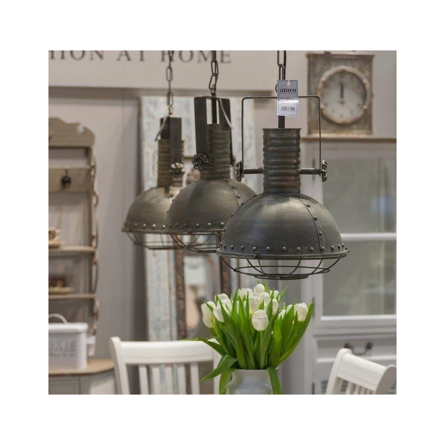 Lampa Mazine to funkcjonalna ozdoba mieszkania zawieszona na długim łańcuchu o dużych oczkach. Klosz przedmiotu jest niezwykle ciekawy – nawiązuje do kształtu lamp używanych niegdyś w dawnych fabrykach i magazynach a więc w pomieszczeniach w stylu industrialnym. Lampa jest surowa w swoim wykonaniu, pomalowana na chłodny, metaliczny kolor o wdzięcznym odcieniu. Dopełnieniem klosza jest metalowa konstrukcja, umieszczona pod strumieniem światła żarówki. Całość prezentuje się interesująco, elegancko i ze smakiem. Polecamy niebanalne lampy w stylu industrialnym!