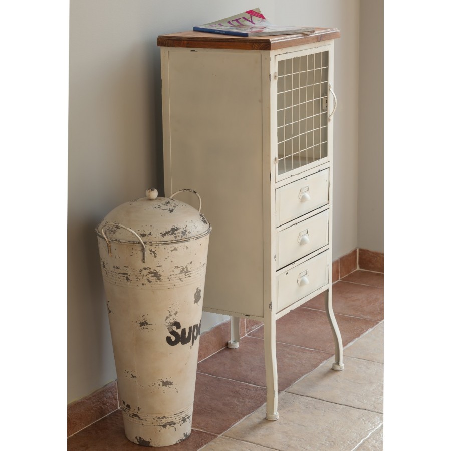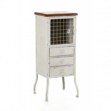 Szafka Lamali swój nietypowy charakter zawdzięcza oryginalnemu zamknięciu półki: wykonanej z metalu, ażurowej kracie. Do tego dołączyć należy surowy charakter wykończenia i liczne, celowe zadrapania. Uwieńczeniem całości jest drewniany blat.