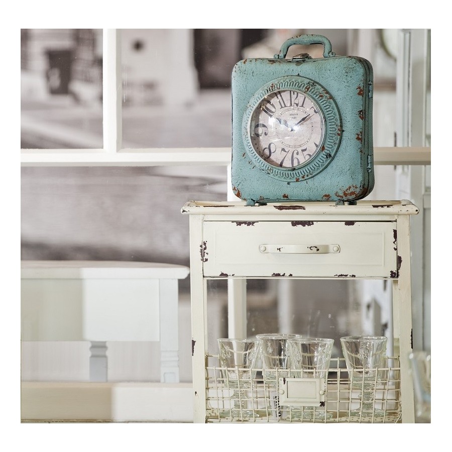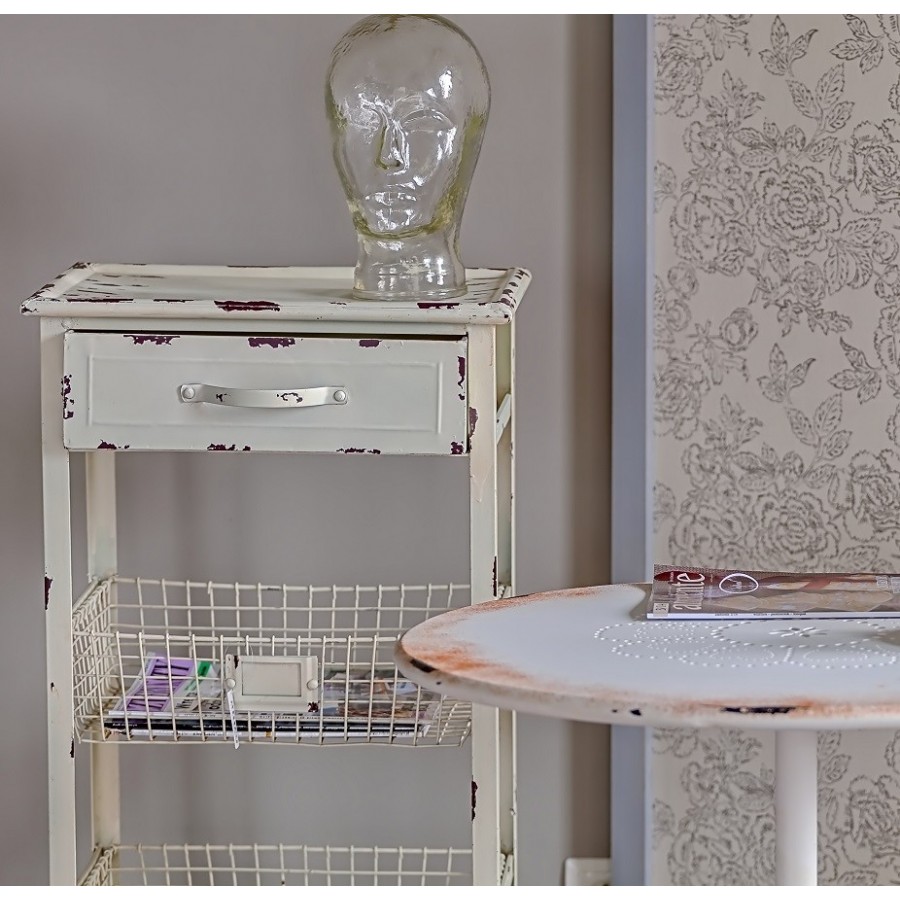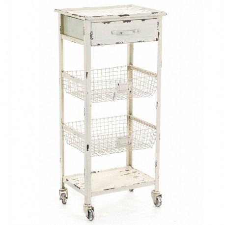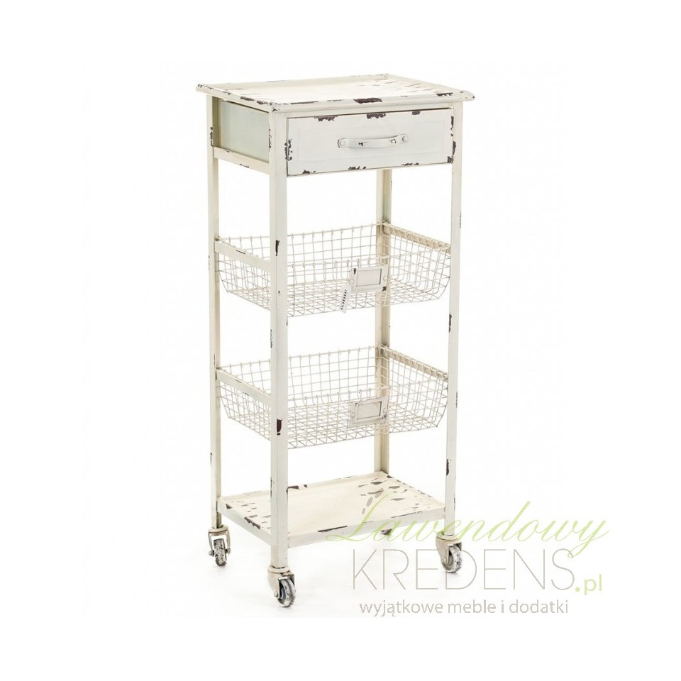 Wielofunkcyjna szafka na kółkach, wykonana z matalu, z pojemnymi, wygodnymi koszykami. Może służyć jako wygodna szafka w łazience, jako przenośny regał na książki, jako szafka na naczynia podczas wieczornych spotkań na zewnątrz. Może pełnić także inne, pomocne zadania w domu czy ogrodzie. Prosta konstrukcja i świetna stylizacja pozwolą wkomponować się jej w każde wnętrze, nie tylko w stylu prowansalskim.