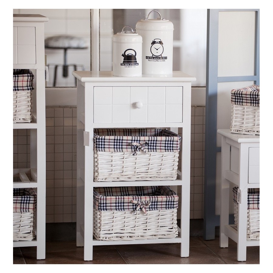 Wiklinowe koszyczki zamiast szuflad nadają szafce klimaty w stylu prowansalskim, gdyż dzięki obszyciu z materiału w czarno-czerwoną kratę są wyjątkowe w swojej formie. Szafka pomalowana jest na biały kolor, dzięki czemu krata na koszykach jeszcze bardziej wyróżnia szafkę na tle pozostałych mebli.