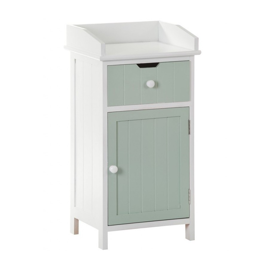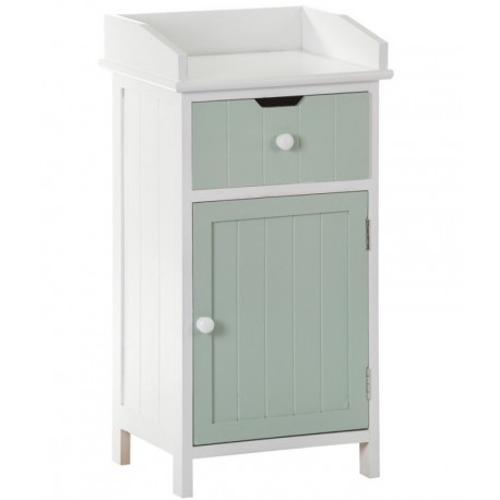 Meble Aluro to seria wyposażenia wnętrz utrzymana w stylu prowansalskim. Szafka Minti to wyjątkowo elegancki mebel z serii dziecięcych mebli Aluro o wysuwanej szafeczce oraz półce zamykanej drzwiczkami. Zarówno szafka, jak i drzwiczki wyposażone są w okrągłe, praktyczne uchwyty. Meble te mogą zostać użyte jako meble dziecięce. Utrzymane są w tonacji letniej mięty oraz bieli – jest to prześlicznie wyglądająca kombinacja barw. Szafeczka zwieńczona jest ładnie wykończonym blatem o zabezpieczonej z trzech stron powierzchni, co zmniejsza prawdopodobieństwo upadku postawionego na blacie przedmiotu. Ładna, elegancka, funkcjonalna – idealna na przykład do dziecięcego pokoju!