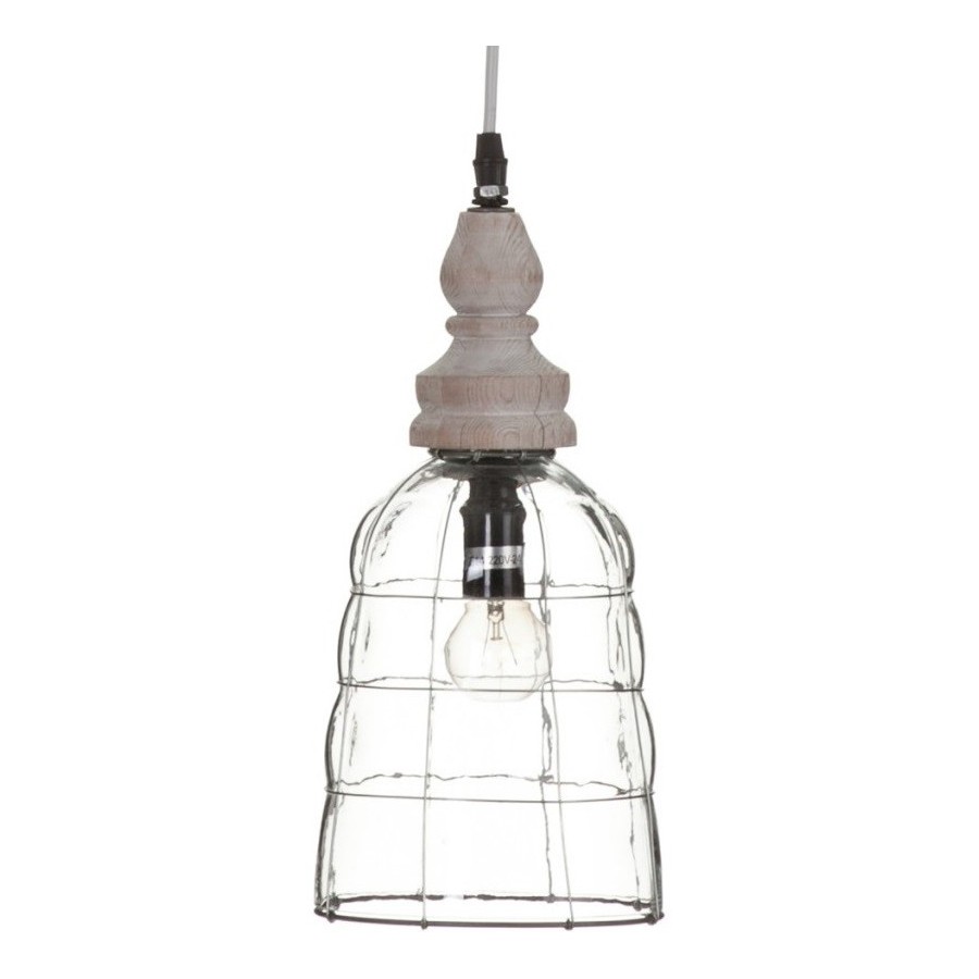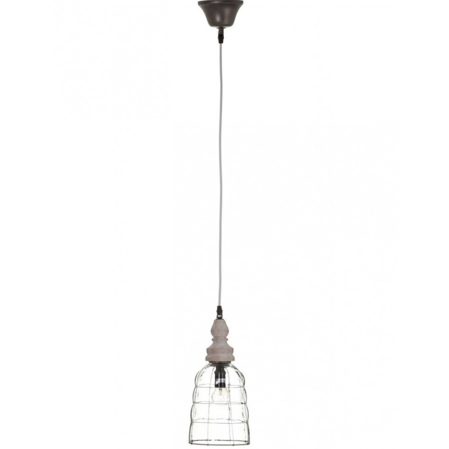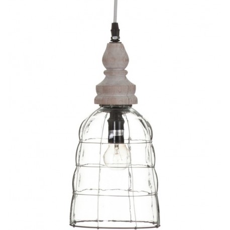 Klimatyczna, bardzo jasna lampa w stylu prowansalskim, której klosz wykonany jest z grubego białego szkła, przeplatanego cienkim drutem, tworzącym delikatne ażurowe wykończenie. Całość zamontowana jest na drewnianej podstawie, z delikatnymi białymi przetarciami.
