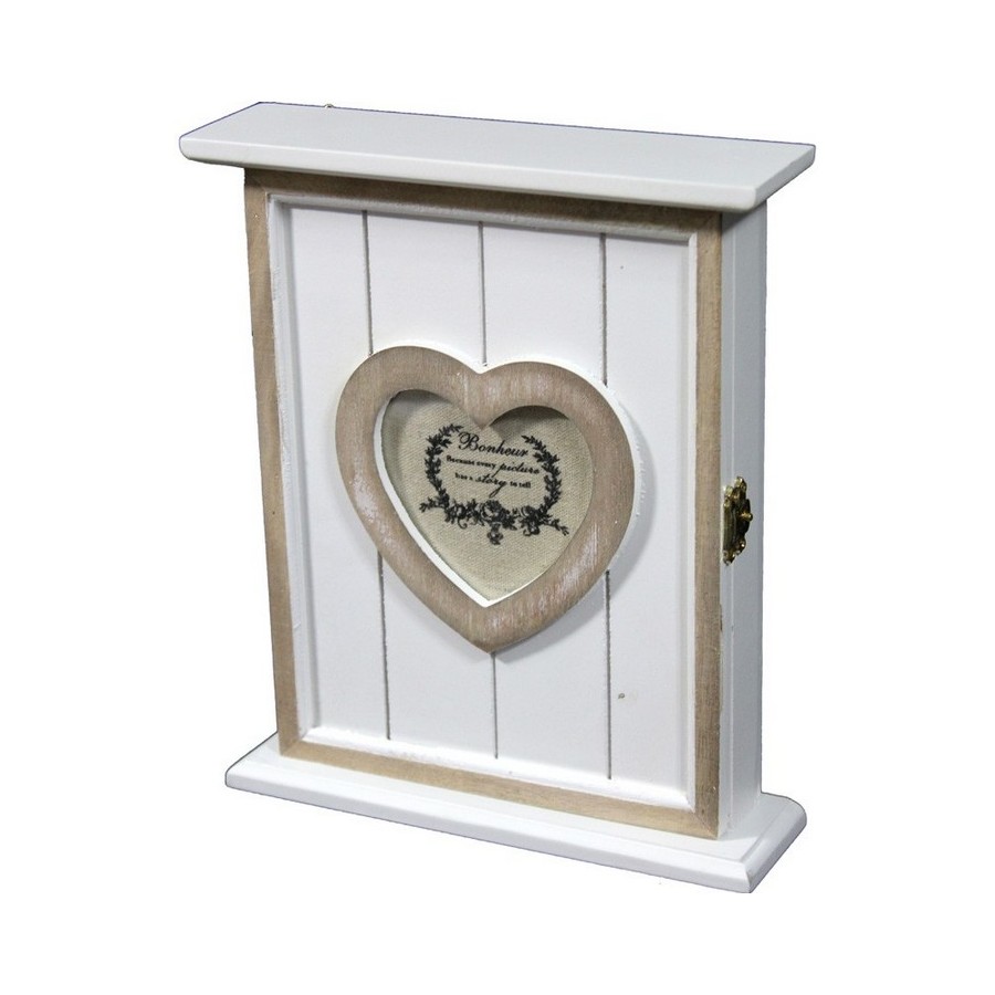 Szafka na klucze w prowansalskim stylu z drzwiczkami i dekoracją w kształcie serca.
