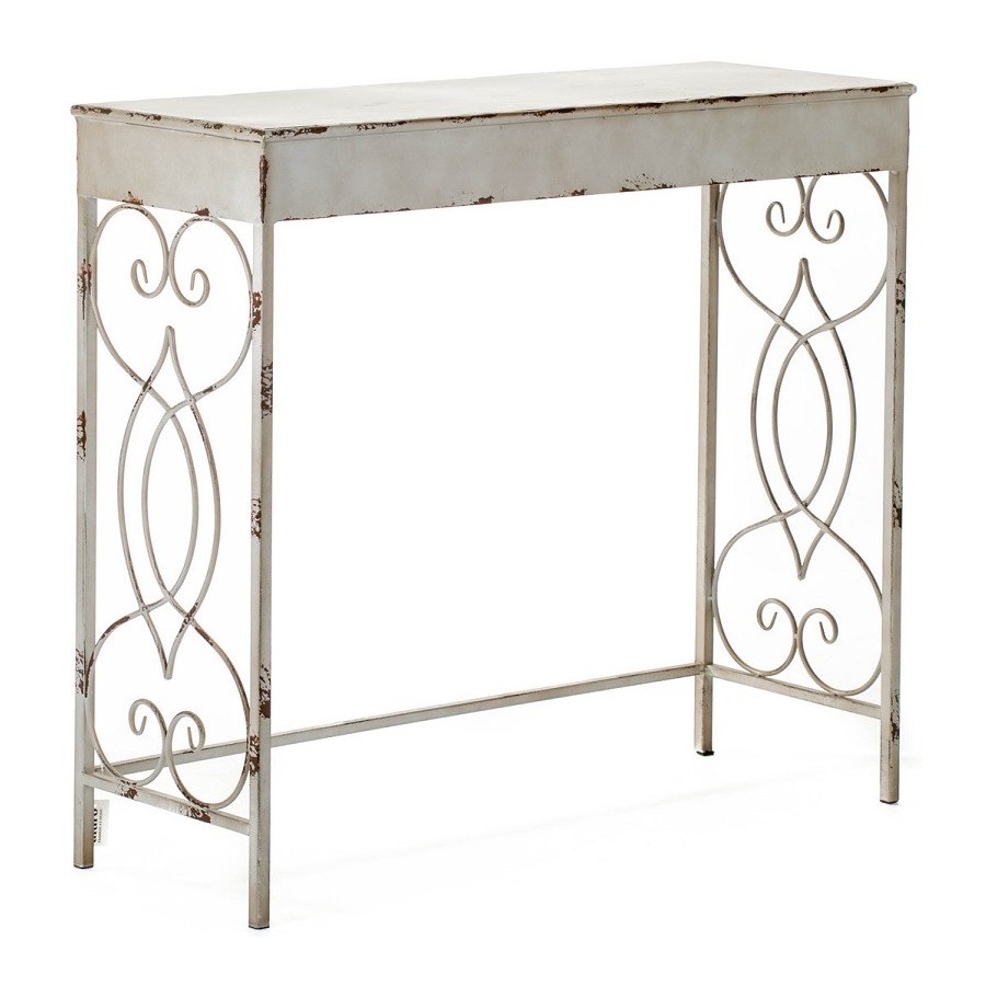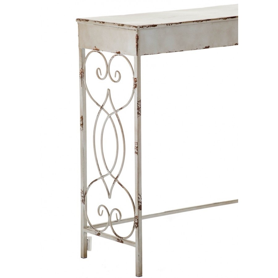 Konsola Aluro Bertoni to pięknie wyglądający i bardzo użyteczny mebel, przeznaczony do użytku w przestrzeni ogrodowej, a także wewnątrz mieszkania. Konsola została ubarwiona na biało, a uważnie wykonane, liczne przetarcia, dodają jej wiekowego charakteru. Całość prezentuje się delikatnie, ujmująco i harmonijnie – tak jak pozostałe meble przecierane z kolekcji metalowych mebli Aluro Bertoni. Polecamy inne meble meble ogordowe i do wnętrz z serii Aluro.