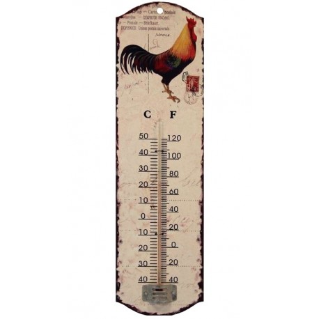 Termometr prowansalski, ze skalą Celsjusza i Fahrenheita, w ładnym kremowym kolorze, udekorowany wizerunkiem koguta.