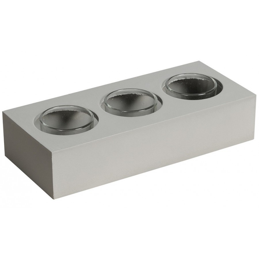 Potrójny świecznik Belldeco w kształcie pudełka to surowo zdobiony przedmiot z trzema otworami i szklanymi naczyniami, przeznaczonymi do umieszczenia w nich wkładów świec. Świecznik wykonano z drewna i pomalowano go na szary, matowy kolor – idealnie wpasuje się w wystrój każdego mieszkania.